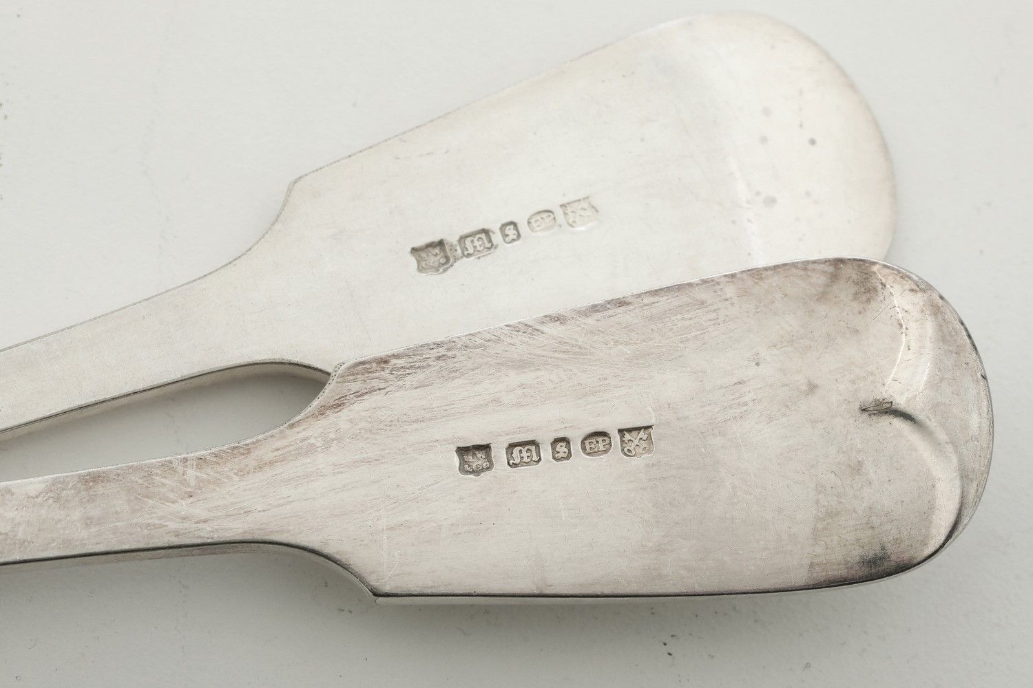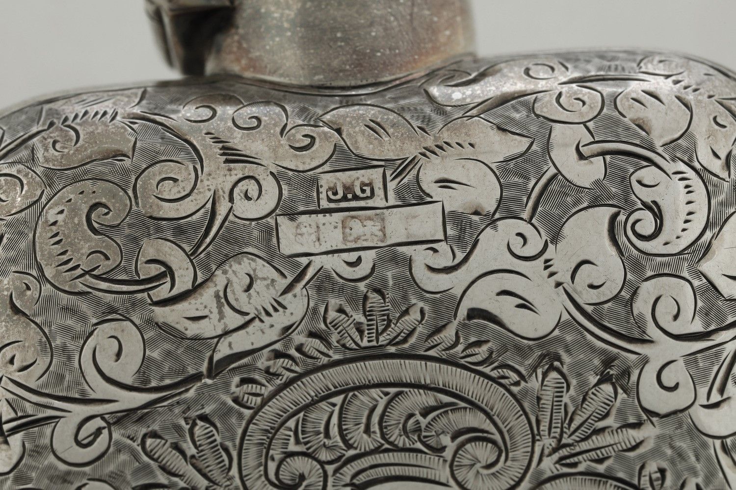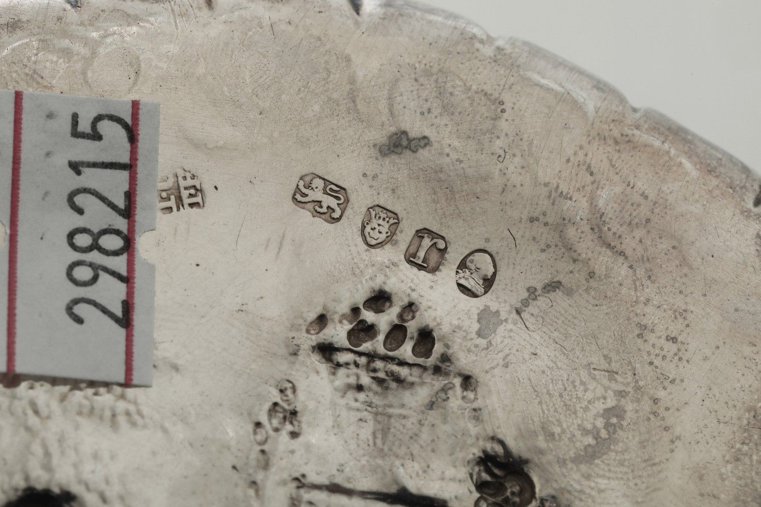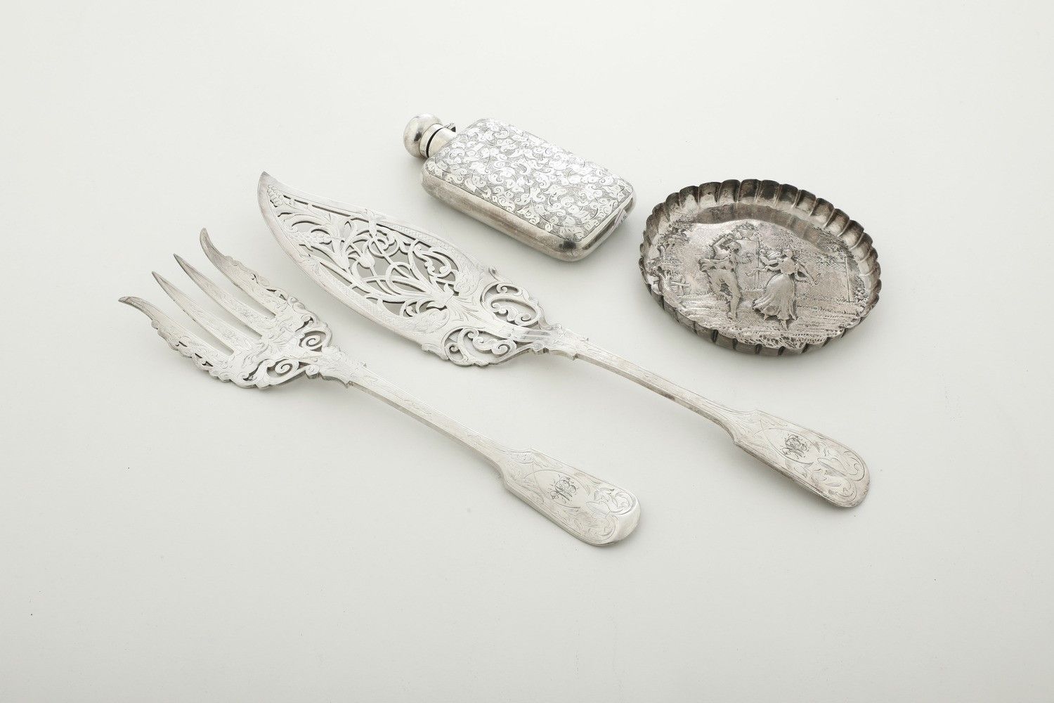 Lotto di 2 posate da dolce in metallo argentato, piattino sbalzato e fiaschetta [..]