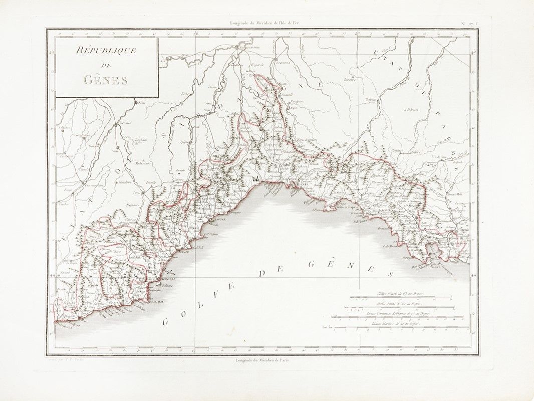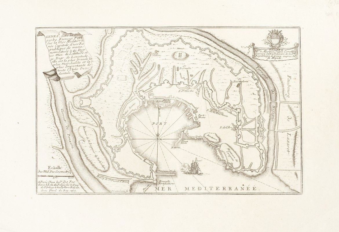 Incisione in rame. mm 174x278. Foglio: mm 263x380. Pianta della città di Genova, dedicata al Marchese di Lomellini, con il suo stemma in alto a destra, dall'atlante militare Les Forces de l'Europe ou description des principals villes..., che raccoglie piante di città fortificate europee, pubblicato in otto edizioni tra il 1690 e il 1695. SI AGGIUNGONO: Pierre François Tardieu (Parigi 1711 - 1771). République de Gênes. Incisione in rame con confini in coloritura. mm 345x450. Foglio: mm 405x553. Da Edme Mentelle, Atlas Universelle de Geographie Physique et Politique Ancienne et Moderne, Paris 1779. / Jacques Nicolas Bellin (Parigi, 1703 - Versailles, 1772). Carte de l'Etat de Genes pour servir à l'Histoire Universelle. Paris: Dépot des Cartes et Plans de la Marine, 1700-1799. Incisione in rame. mm 225x330. Foglio: mm 258x380. / Id., Plan de la ville de Gênes et de ses environs. Incisione in rame. mm 233x 185.Foglio: mm 317x235.