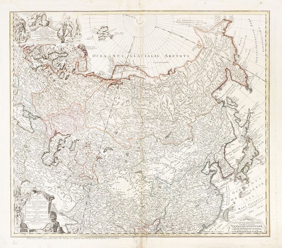 Incisione in rame in coloritura. mm 505x575 Foglio: mm 540x622. Dettagliata mappa dell'Impero russo che copre la regione dal Mar Baltico attraverso la Siberia fino alla Corea e al Giappone. Cartiglio decorativo per il titolo con cacciatori e teste di cervo e orso. In alto altro cartiglio dedicatorio ad Anna Ivanovna, nipote di Pietro il Grande nonché figlia di Ivan V di Russia. SI AGGIUNGONO: Id., Hungariae ampliori significatu et veteris vel methodicae, complexae regna, Hungariae propriae, Croatiae, Dalmatiae, Bosniae, Serviae, Bulgariae, Cumaniae, principatum Transsylvaniae... Nuremberg: Homannianis Heredibus , 1744. Incisione in rame in coloritura. mm 505x620. Foglio: mm 540x628. / Georg Braun (Colonia,1541 - 1622), Frans Hogenberg (Mechelen, 1535 - Colonia, 1590). Haderslebia in Ducati Slesuicensi... (Haderslev, oggi in Danimarca),1588 e sgg. Incisione in rame in coloritura. mm 180x460. Foglio: mm 238x538. Parte inferiore della tavola contenente nella parte alta la veduta della cittadina tedesca di Husum / Id., Vienna, Vulgo Vienne de France. Incisione in rame in coloritura. mm 180x470. Foglio: mm 215x522. Parte inferiore della tavola contenente nella parte alta la veduta di Lugdunum vulgo Lion (Lione).