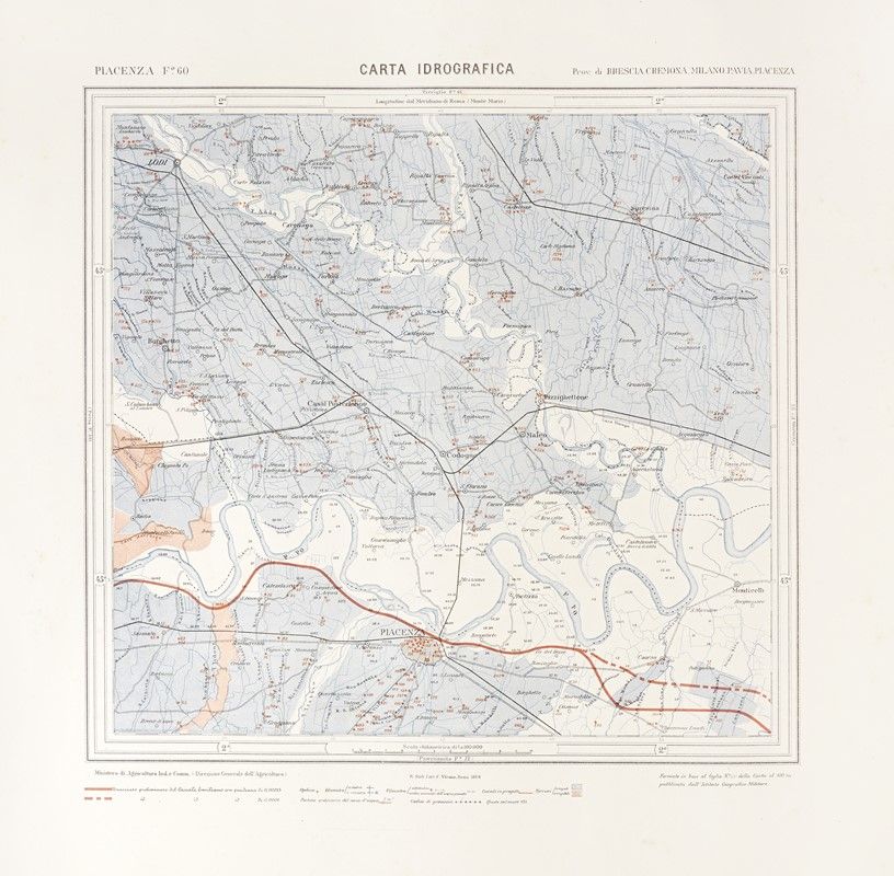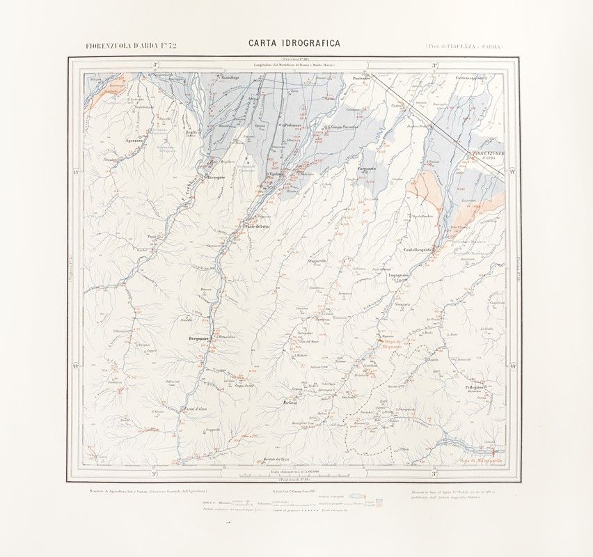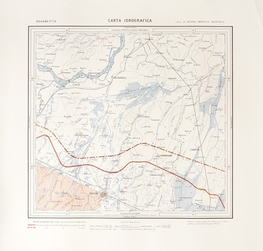 Cromolitografia. mm 440x415. Foglio: mm 620x705. Lotto di 11 Carte idrografiche del Regno d'Italia (Ministero di Industria, Agricoltura e Commercio, Direzione Generale dell'Agricoltura, anni 1887-88-89). Fogli nn.: 87 Bologna / 98 Vergato / 88 Imola / 89 Ravenna /76 Ferrara / 77 Comacchio / 60 Piacenza /72 Fiorenzuola d’Arda/ 73 Parma / 74 Reggio Emilia / / 75 Mirandola.