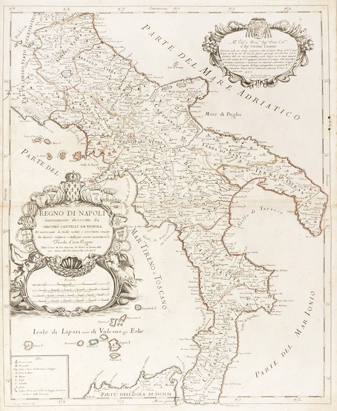 Incisione in rame con confini in coloritura. mm568x455. Foglio: mm 605x470. Con il nome dell'incisore Giorgio Widman in basso a sinistra. Mappa tratta dal Mercurio geografico... raccolta di carte edita a Roma tra il 1660 e il 1730.