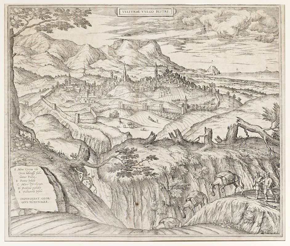 Incisione in rame. mm 345x400. Foglio: mm 403x543. Testo latino al verso. Dal III volume di Civitatis Orbis Terrarum pubblicato per la prima volta in edizione latina nel 1581. Testo latino al verso. Veduta disegnata da Georg Hoefnagel che compare nella composizione in basso a destra insieme ad Abraham Ortelius: i due viaggiarono insieme attraverso l'Italia nel 1578. Veduta a volo d'uccello di Velletri e delle colline intorno a Coru presa da nord-ovest. Sulla destra si scorgono le paludi pontine (D), in lontananza Capo Circeo (A) e l'Isola di Ponza (B). Nel centro del paese si osserva la chiesa di Sancta Maria del Trivio e accanto ad essa la gotica Torre del Trivio, simbolo del paese. La guglia di destra appartiene alla cattedrale di San Clemente I, che fu la chiesa titolare del cardinale Joseph Ratzinger, papa Benedetto XVI. Tra la cattedrale e la Torre del Trivio si trova il Palazzo Comunale, che oggi ospita il Comune e un museo. Velletri appartenne allo Stato Pontificio dal Medioevo fino all'Unità d'Italia.