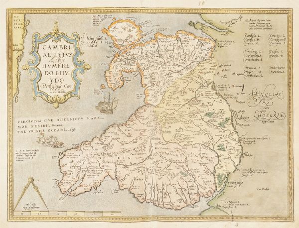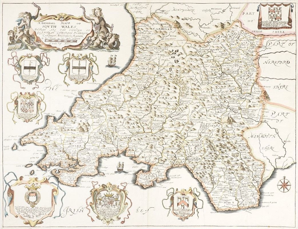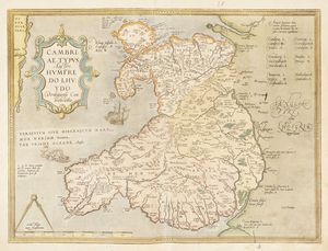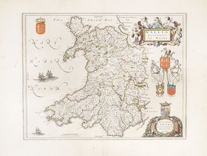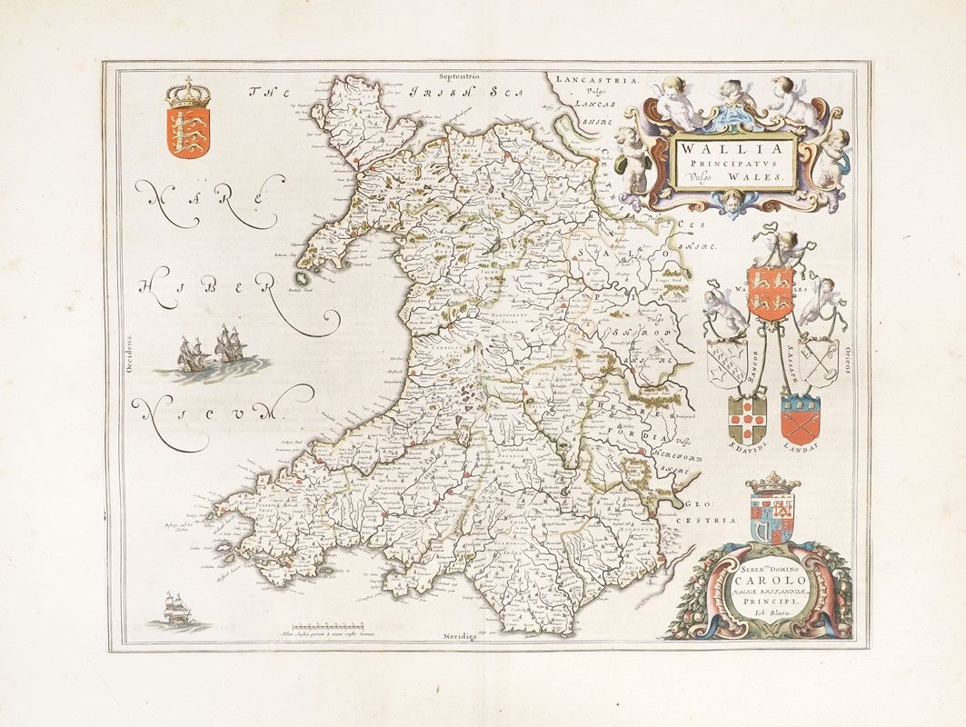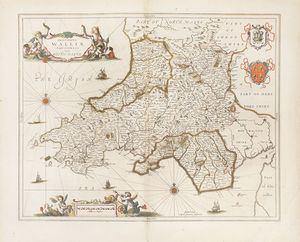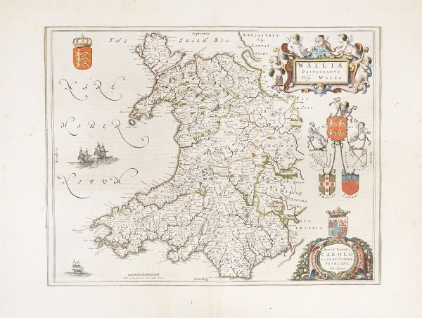 Incisione in rame in coloritura. mm 387x500. Foglio: mm 505x655.Testo latino al verso. Mappa del Galles con grande cartiglio con cherubini per il titolo e altro per la dedica a Carlo, principe di Galles, poi Carlo II, presenti anche lo stemma reale e altri cinque stemmi legati tra loro e sorretti in alto da cherubini. SI AGGIUNGONO: Jan Jansson (1588-1664), Principatus Walliae Pars Australis vulgo South-Wales. Amstelodami:apud Joannem Janssonium, 1646. Incisione in rame in coloritura. mm 414x525. Foglio: mm 510x600. Testo latino al verso. / Robert Morden (1650-1703), South Wales By Rob't Morden. 1695 ca. Incisione in rame in coloritura. mm 360x433. Foglio: mm 388x448. / Richard Blome. A Generall Mapp of South Wales. London, 1670 ca. Incisione in rame in coloritura. mm 354x464. Foglio: mm 363x468. Mappa del Galles meridionale da una coppia contenente anche la parte settentrionale, basata sulla cartografia di Speed, dalla prima edizione di Britannia, la serie più ampia di mappe dedicate alle contee inglesi. / Abraham Ortelius Cambriae Typus. Incisione in rame in coloritura. mm 367x490. Foglio: mm 403x528. Testo latino al verso. Prima mappa a stampa che mostra il Galles come regione indipendente, fu disegnata da Humphrey Llwyd (1527–1568) poco prima della sua morte e pubblicata per la prima volta nel 1573 da Abraham Ortelius.