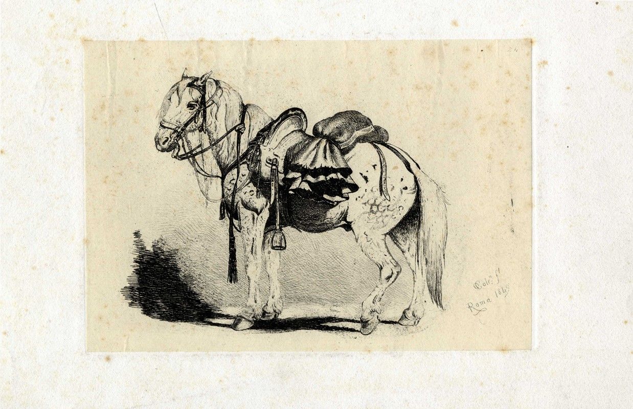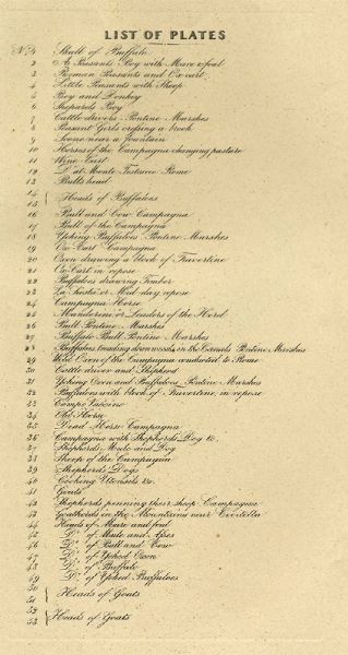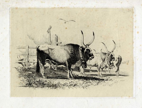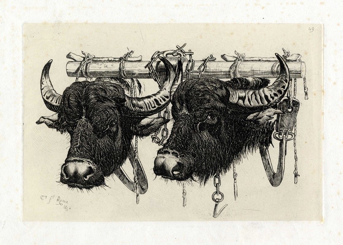 La Campagna Romana. 1929. mm 90/200x120/300. Foglio: mm 500x350 cad. Album in formato verticale contenente 53 plance in fotolitografia, ognuna recante firma, data e luogo ai margini di ciascuna lastra. Edita dalla Libreria Internazionale F.lli Treves dell'Ali di Roma. Ristampa moderna della raccolta originariamente realizzata nel 1850. SI AGGIUNGE: Id., Raccolta di 7 fogli incisi con teste d'animale, 1849-50. Acqueforti su velina applicata. mm 85/200x185/265. Foglio: mm 160/500x275/350. Ogni opera presenta firma, luogo e data riportati lungo i margini di ciascuna lastra. Opere facenti parte dell'edizione originale de La Campagna Romana.