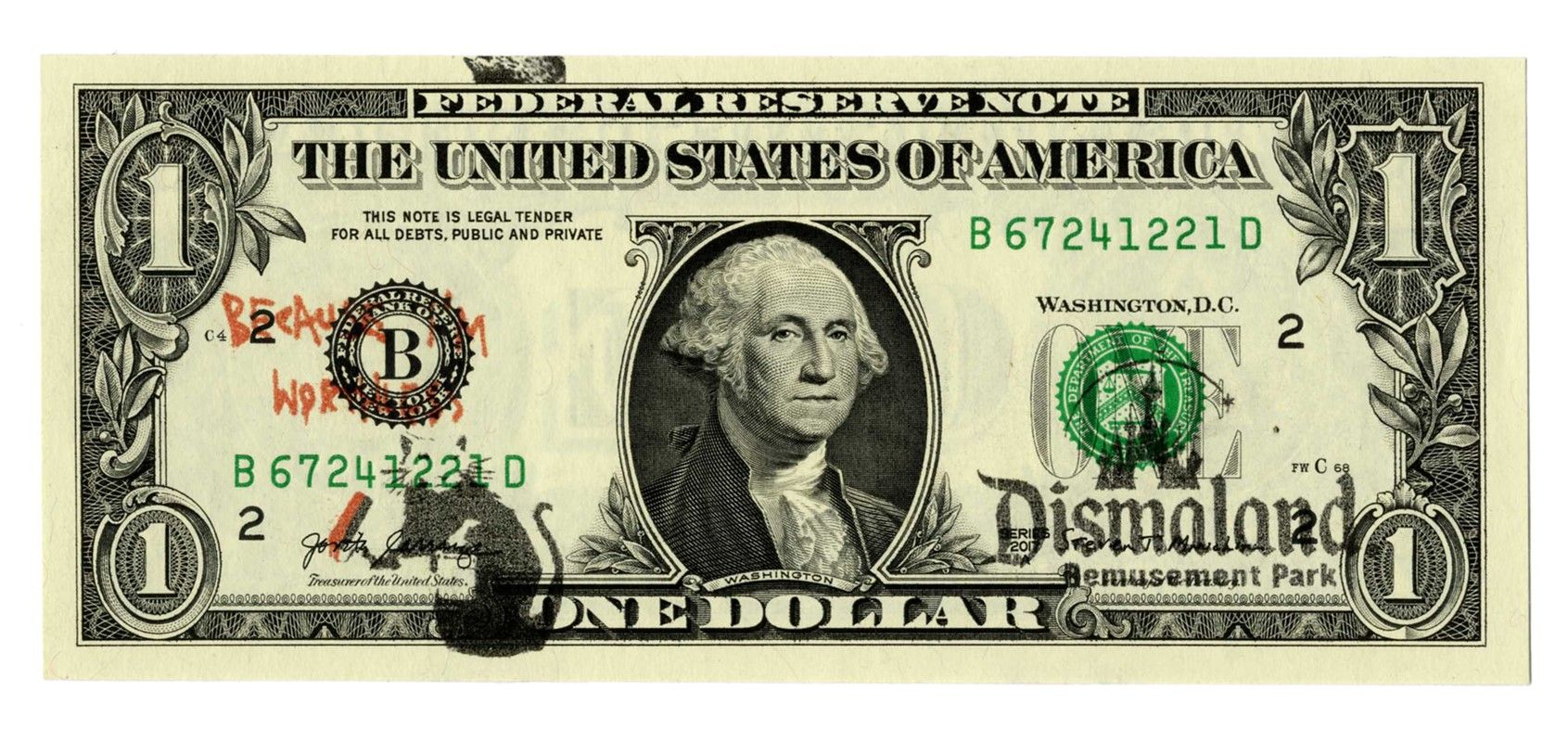 Stampa su banconota da 1 dollaro. mm 66x156. Timbro di Dismaland in basso a destra. Opera accompagnata dal ticket d'ingresso a Dismaland. Provenienza: Performance di Dismaland; Collezione fiorentina.