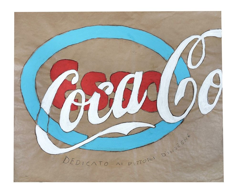 Tecnica mista su offset. mm 980x1200. Timbro a secco di Mario Schifano in basso a destra e iscritto a carboncino: "S_". In basso a sinistra, ancora a carboncino, "P.A" e in basso al centro: "Dedicati ai pittori d'inségné".