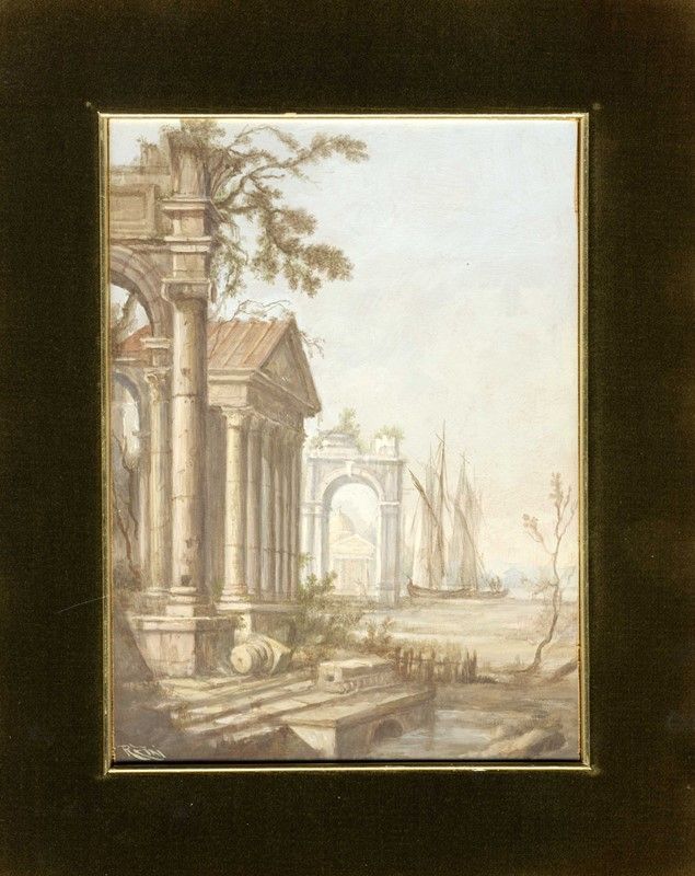 Tempere su tavoletta. cm 22,5x17 cad. Entrambe firmate in basso a sinistra. Le opere raffigurano scorci di rovine dove la presenza naturale sembra riappropriarsi dello spazio. Due dipinti paesaggistici realizzati dettagliando minuziosamente ogni piccolo aspetto della composizione.