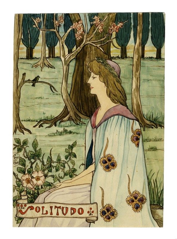 1) Solitudo. Acquerello e penna e inchiostro di china bruno su carta. mm 238x168. Firmato e datato al margine sinistro. Titolato in basso a sinistra. 2) Ritratto di dama con fragole. Acquerello e penna e inchiostro di china su carta. mm diam. 145. Firmato in basso a destra. Opera ispirata dalla serie delle quattro stagioni originariamente stampate su seta di Henri Privat Livemont, dove ne La Printemps una donna di profilo ha il proprio capo adornato da una corona di fragole.