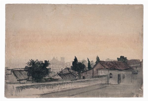 Acquerello su carta greve. mm 390x570. Firma a penna e inchiostro bruno al margine inferiore, controfirma a penna a sfera nera all'angolo inferiore destro. Timbro a secco poco leggibile in basso a destra.