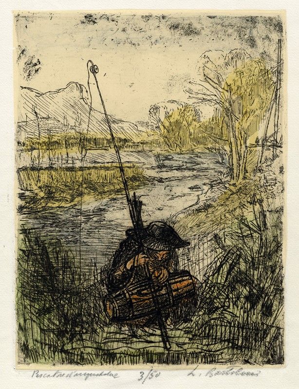 Acquaforte colorata su fondino crema. mm 320x245. Foglio: mm 500x350. Firmata, titolata e numerata a matita. Es. n. 3/50. Intervento manuale all'acquerello sulla figura. L'artista indica come data di esecuzione il 1936. Rispetto all’esemplare pubblicato in Luigi Bartolini. Gli esemplari unici o rari (es. 1/30), si nota qualche piccola differenza ottenuta in fase di inchiostrazione per lo più nel paesaggio di sfondo (es. assenza della macchia nera lungo il palo a destra). Uno dei soggetti più famosi e più riprodotti di Bartolini, l'incisione fu presente alla XLVIII Mostra della città di Roma del 1941 e fu esposta alla XXII Biennale di Venezia, giugno-settembre 1942.