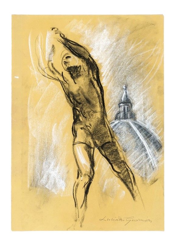 Carboncino nero e bianco su carta ocra. mm 485x340. Firmato a matita in basso a destra.
