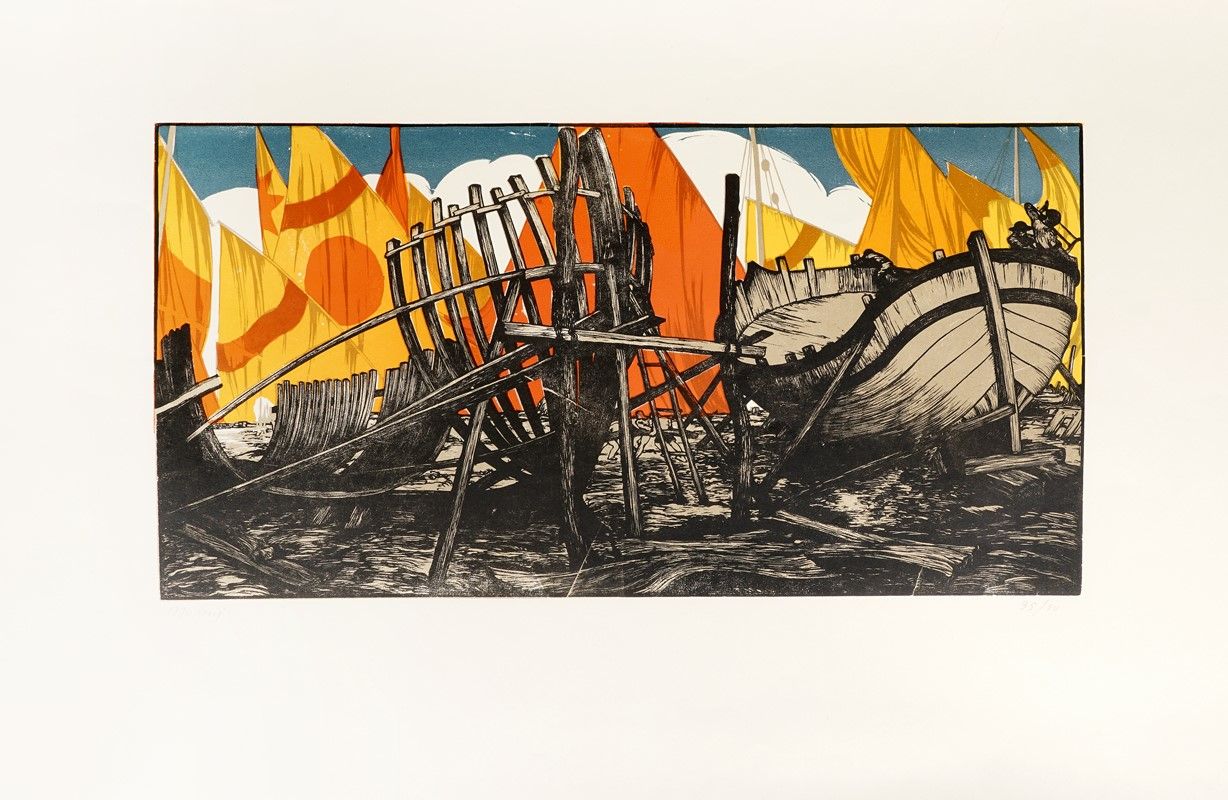 Xilografia policroma a 6 legni. mm 250x490. Foglio: mm 500x695. DIRANI, 113. Firmata a matita in basso a sinistra e tiratura in basso a destra. Es. 35/50. Ampi margini.