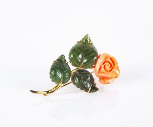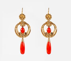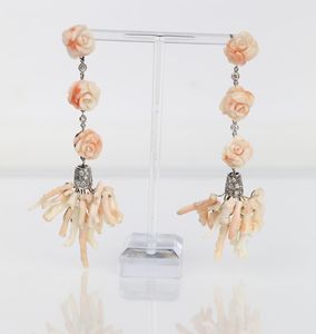 Coppia di orecchini pendenti in oro, corallo e brillanti