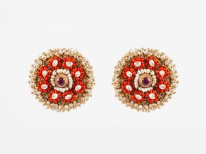 Lunghezza cm 7,5 Oro giallo 750/000. Microperle, corallo rosso. Peso gr. 10,70.