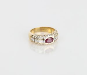 Misura 13 Oro giallo 750/000. Rubino taglio ovale e diamanti ct 2,10 ca. Peso complessivo gr 6,40.