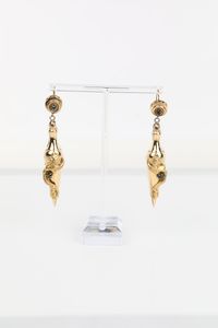 Lunghezza girocollo cm 44, orecchini cm 9. Oro giallo 750/000. Peso complessivo gr. 25,20.