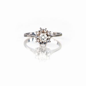 Misura 17 Oro bianco 750/000. Diamanti in taglio rotondo brillante ct 0,70 ca. Peso complessivo gr 4,80.