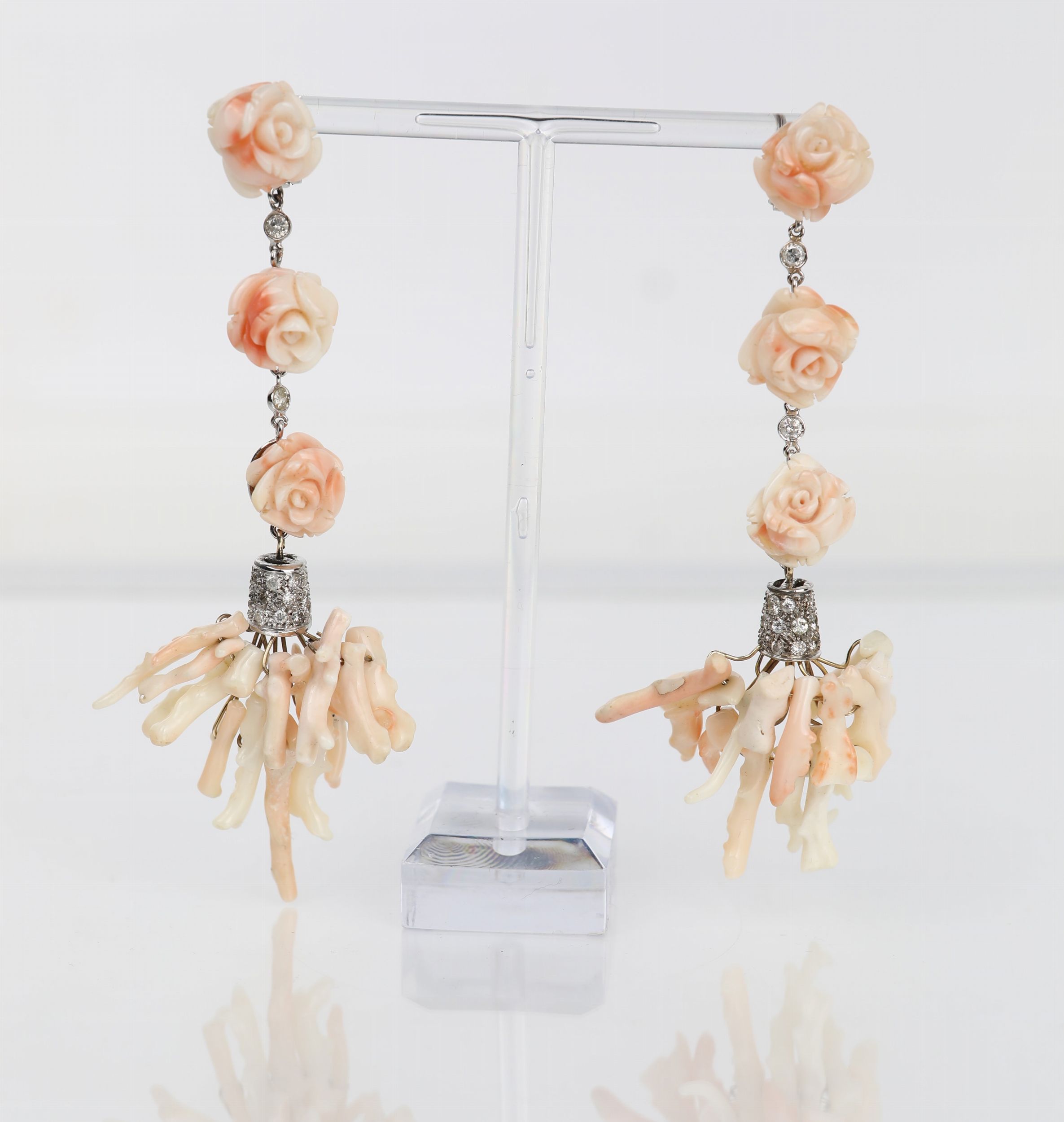 Coppia di orecchini pendenti in oro, corallo e brillanti
