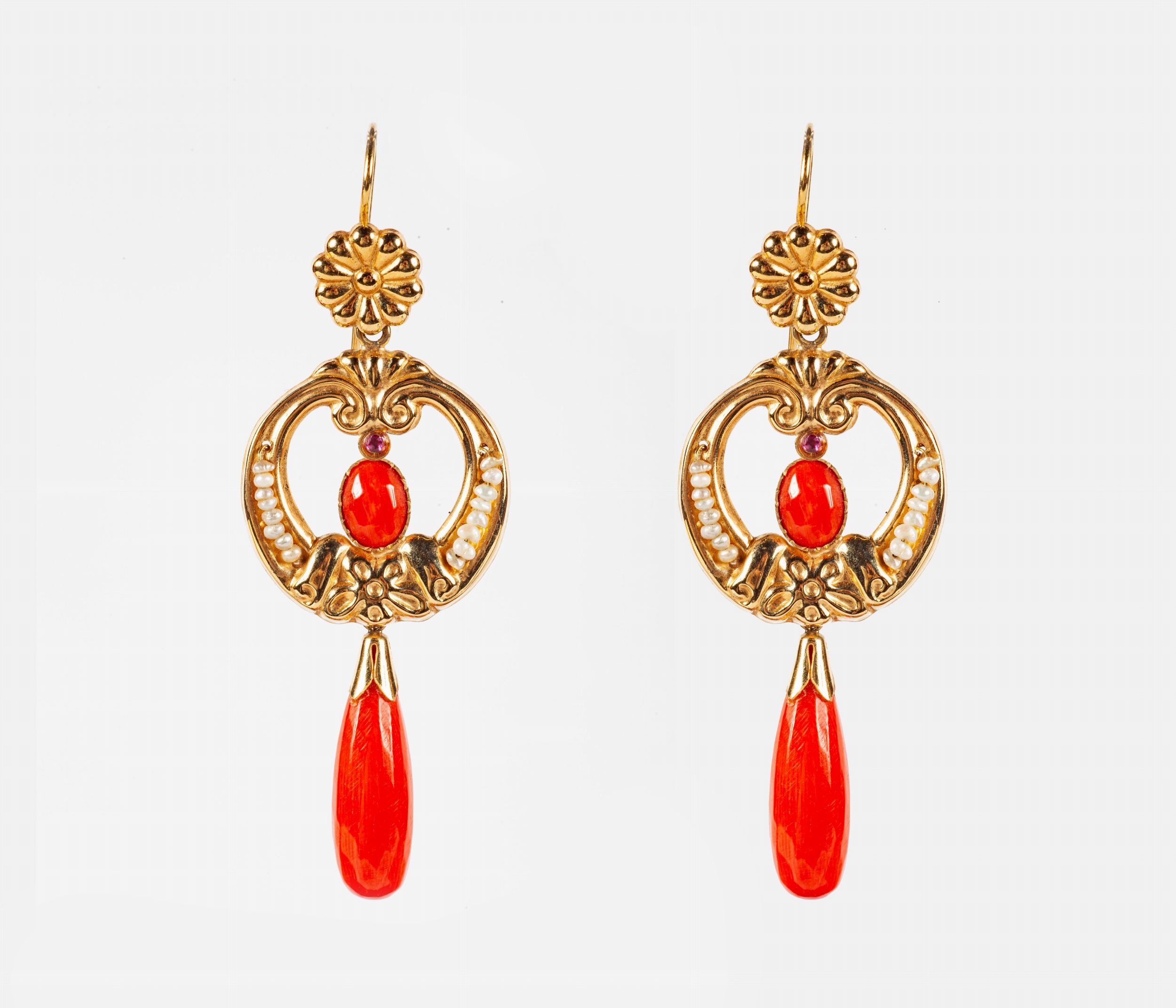 Oro giallo 750/000. Microperle, corallo rosso. Peso gr. 10,70.