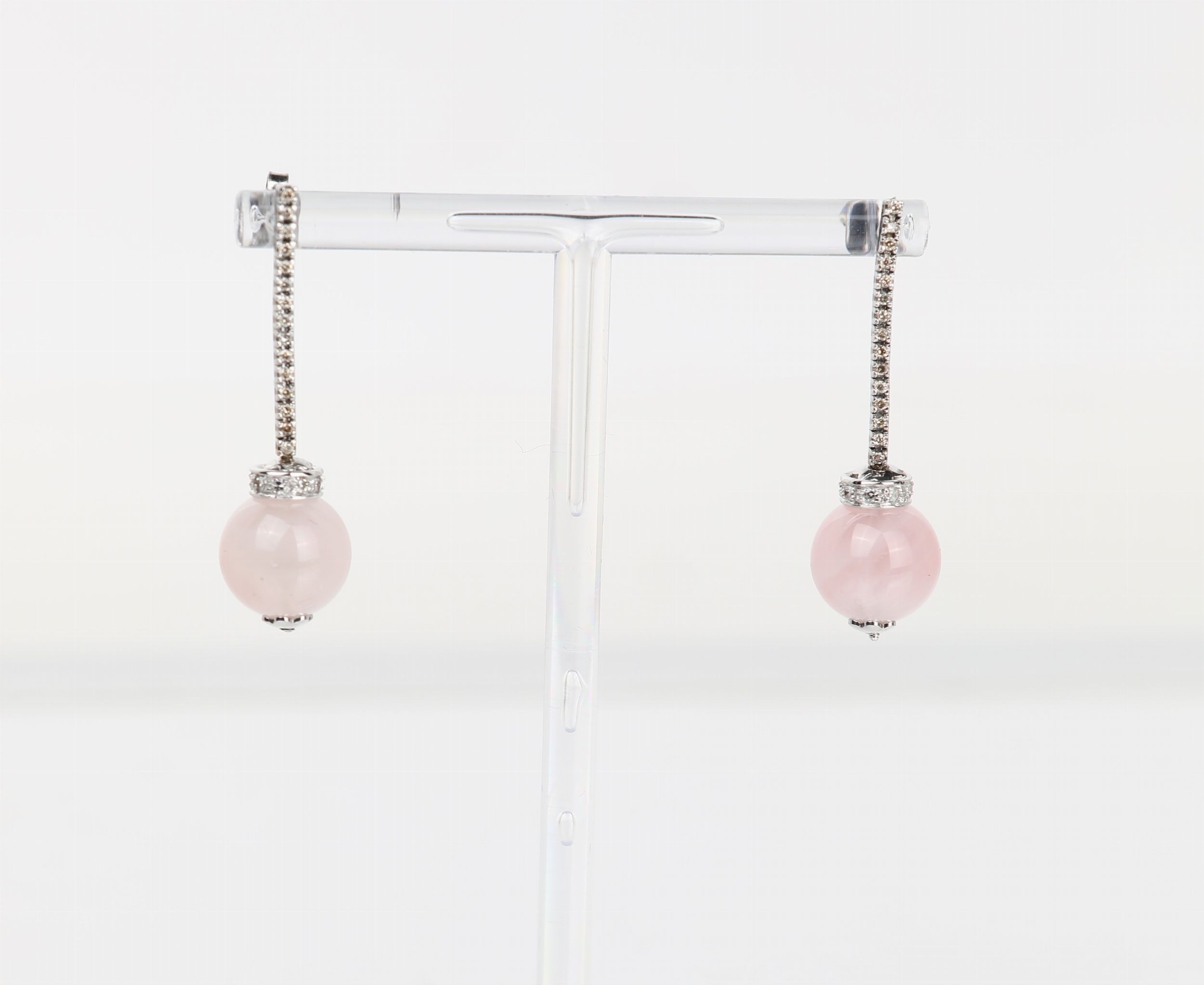 Coppia di orecchini pendenti in oro, quarzo rosa e brillanti