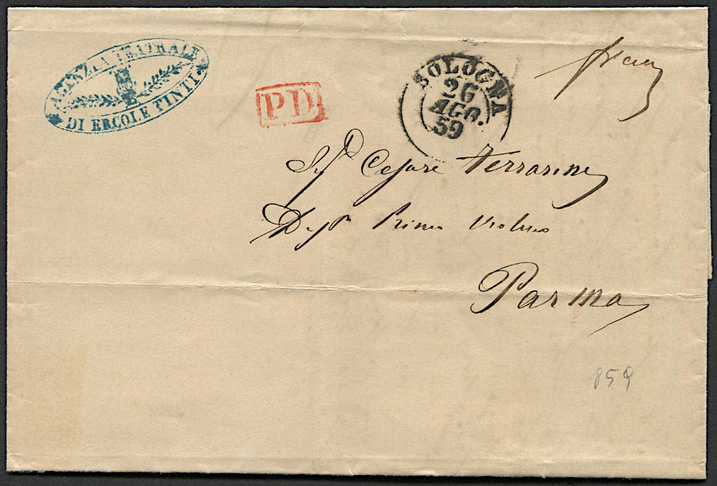 1859, Romagne, Amministrazione Postale post-Pontificia, Lettera da Bologna per Parma [..]