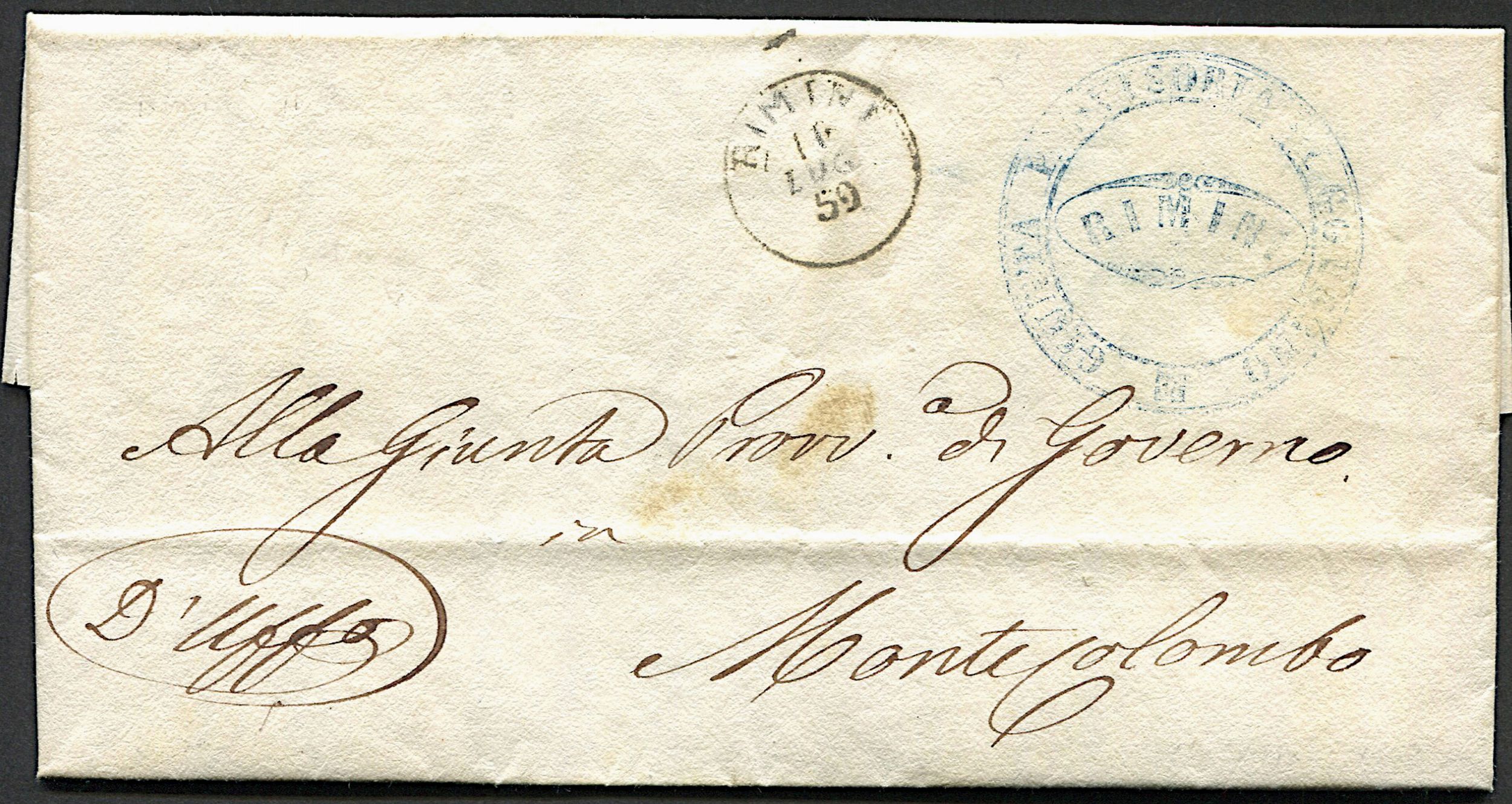 1859, Romagne, lettera in franchigia da Rimini per Montecolombo dell'11 luglio 1 [..]