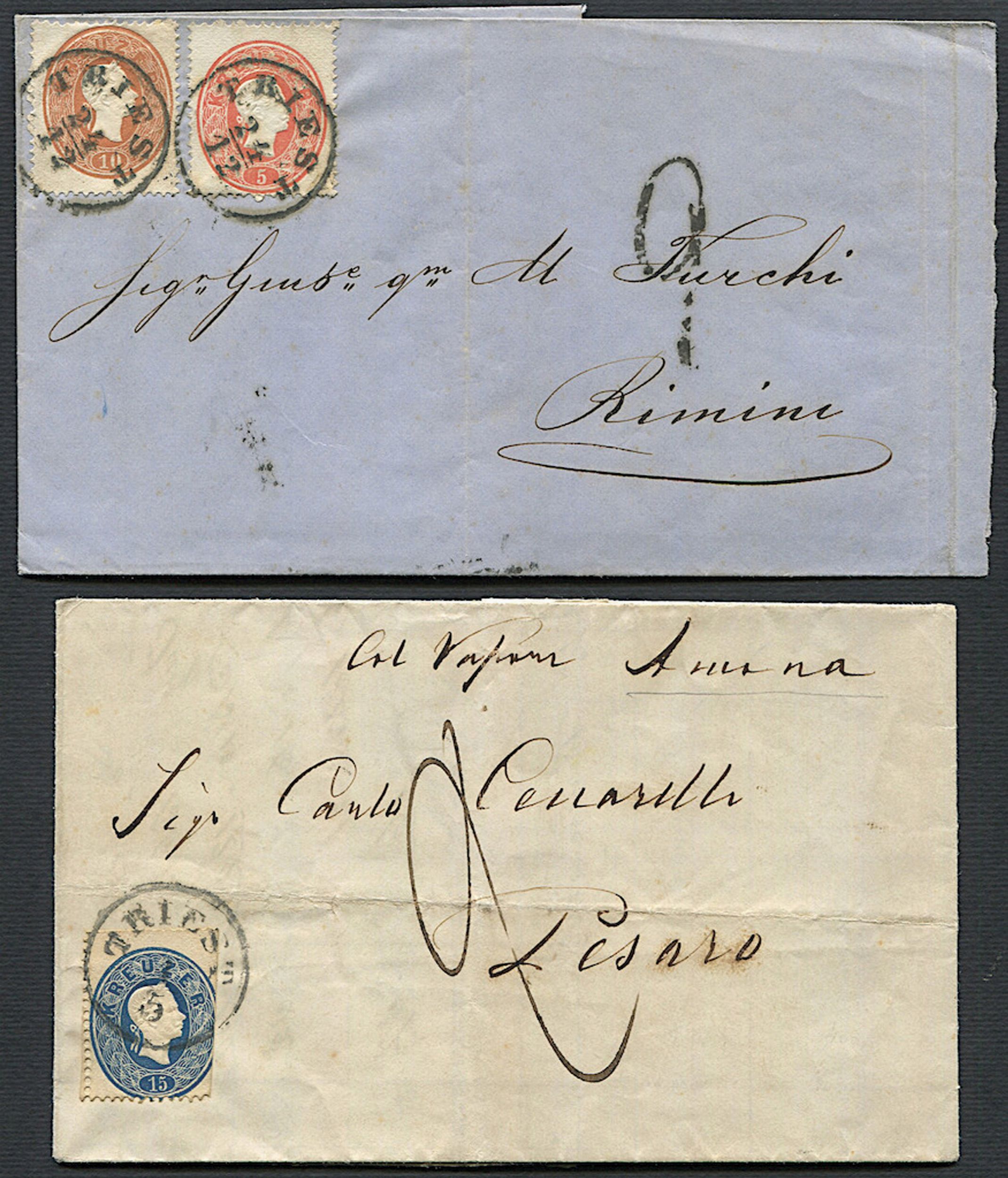 1861, Lombardo Veneto, due lettere da Trieste in tariffa da 15 soldi
