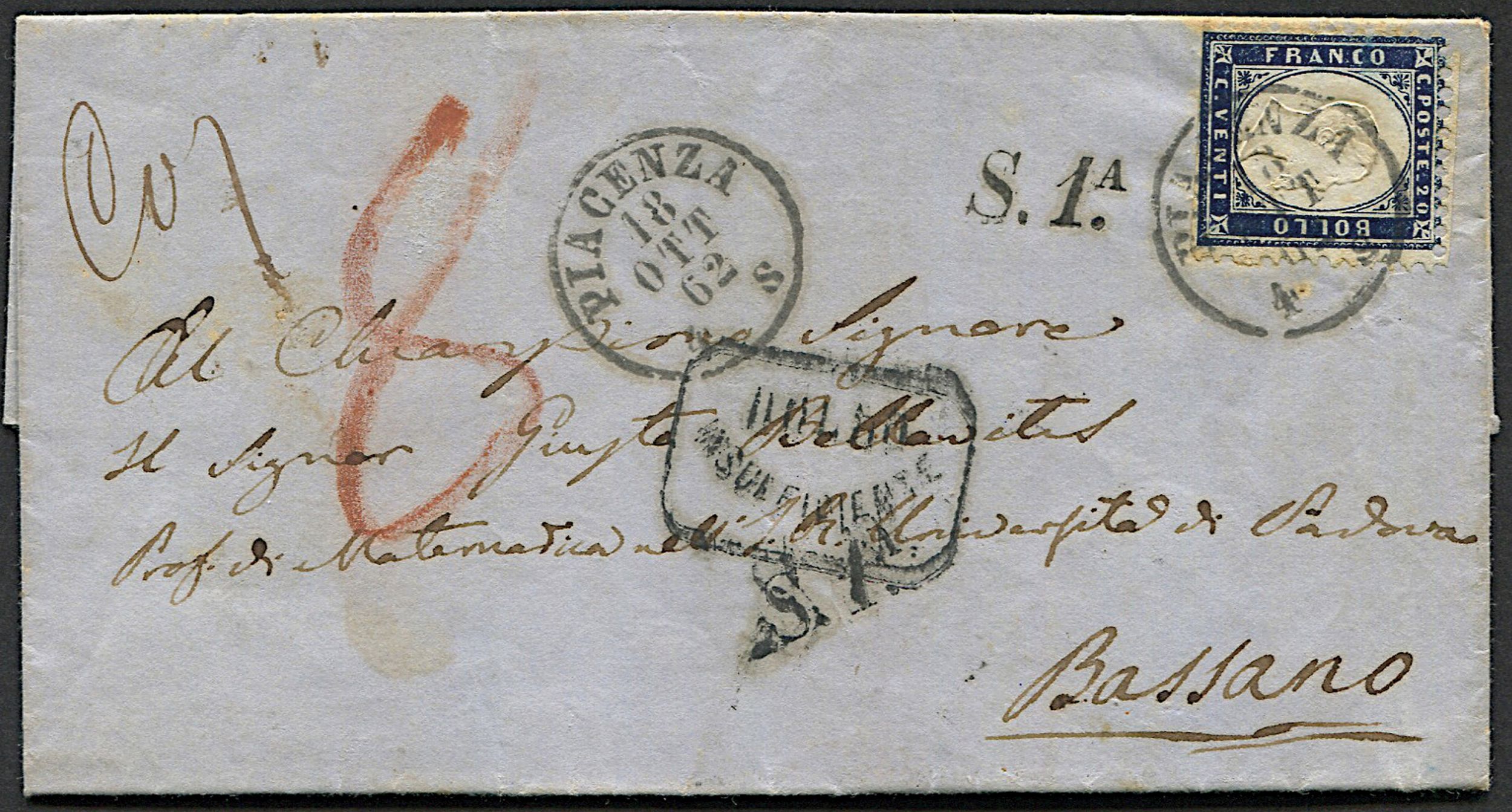 1862, Regno d’Italia, lettera da Piacenza per Bassano del 18 ottobre 1862