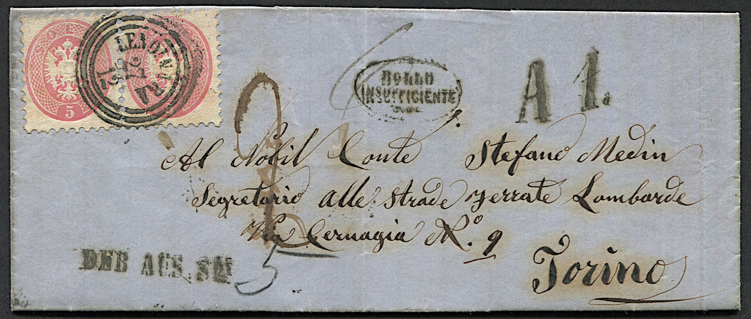 1865, Lombardo Veneto, lettera da Lendinara per Torino del 27 dicembre 1865