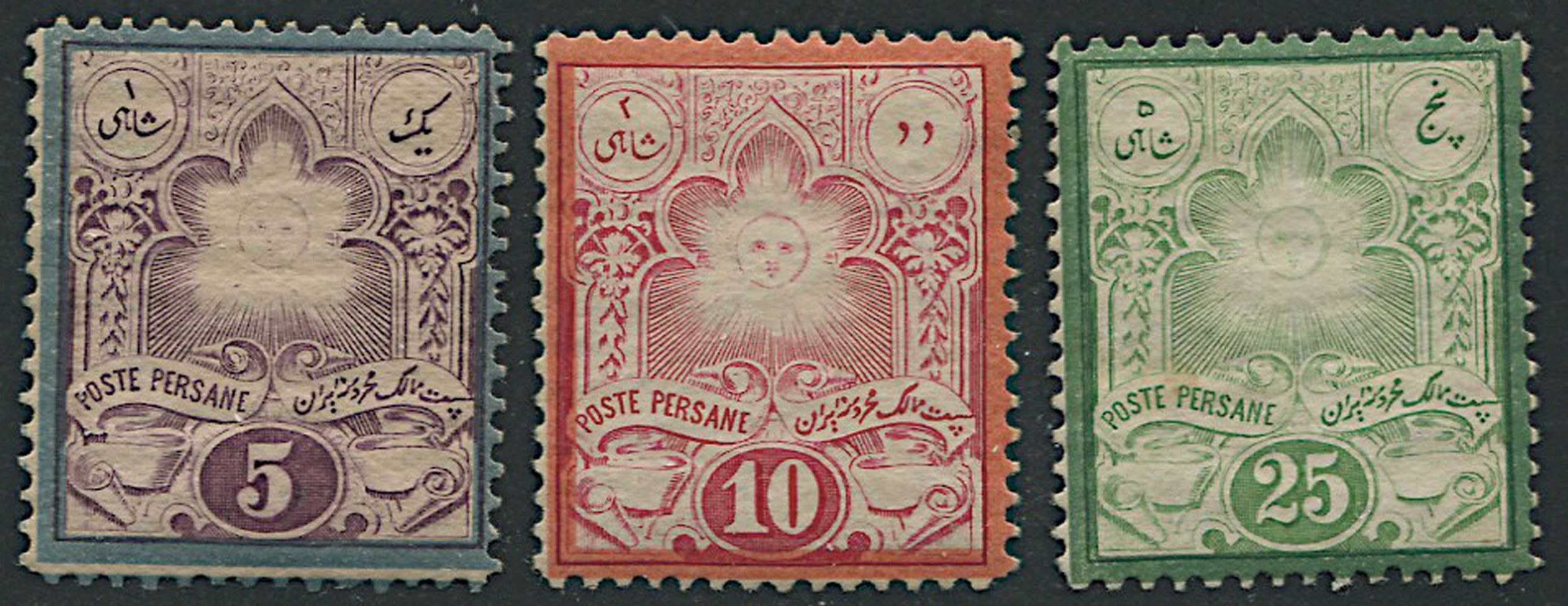 1881, Persia, 5 c. violet, 10 cent. carmine, 25 c. green