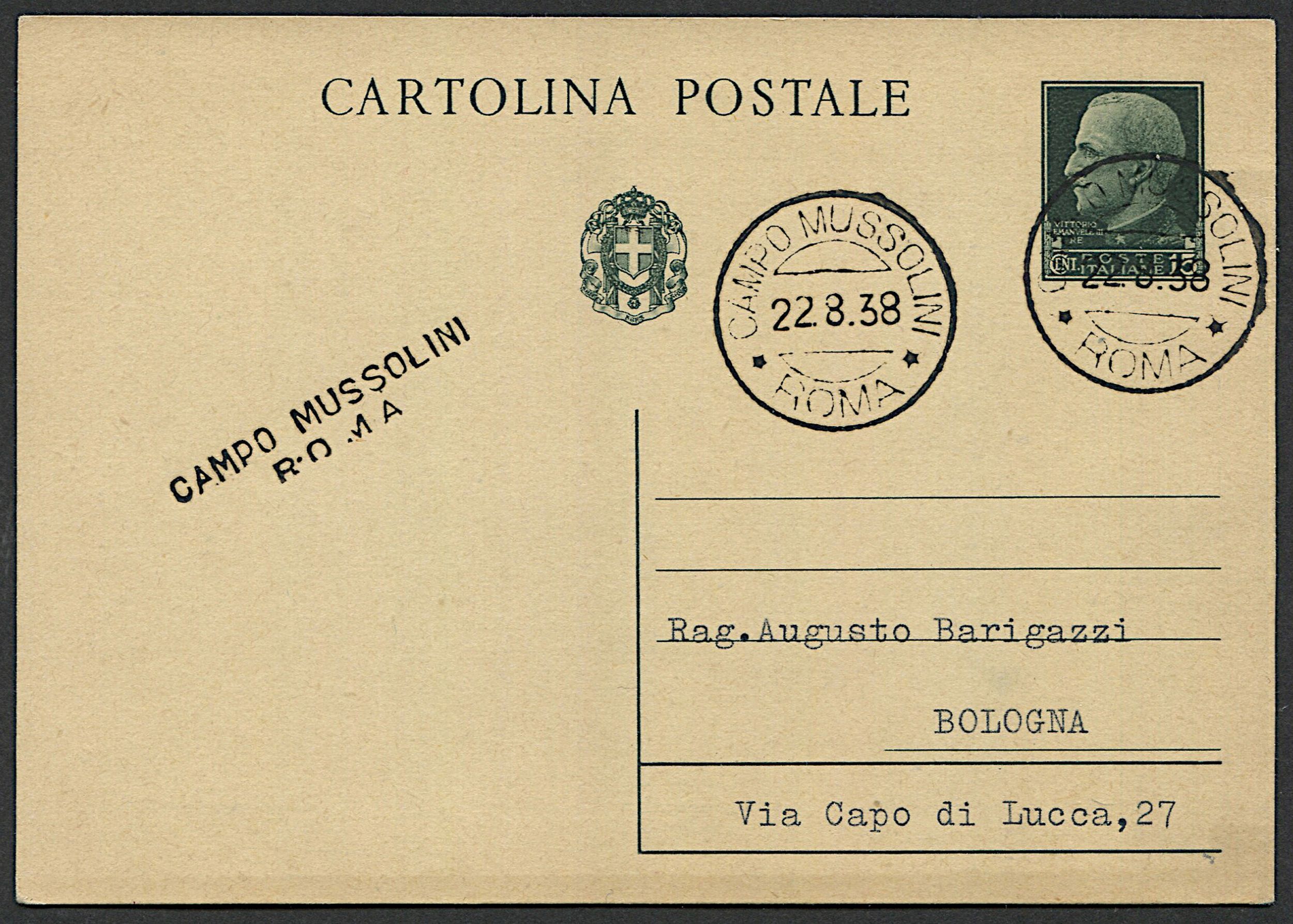 1938,Regno d'Italia,cartolina postale da 15c., viaggiata dal Campo Mussolini il [..]