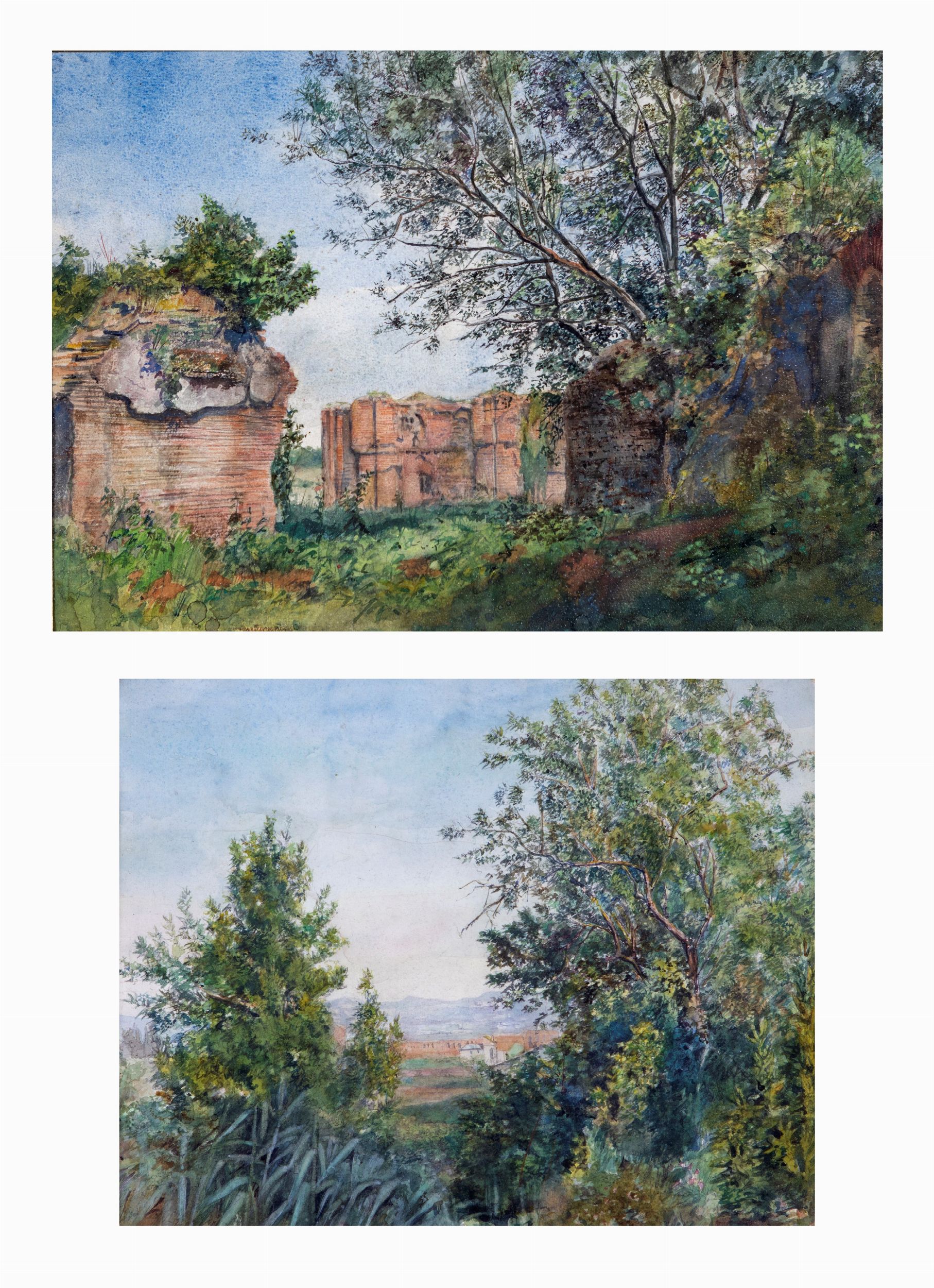 a) Paesaggio con rovine b) Paesaggio con paese in lontananza