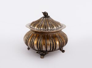 cm 11x12 di forma circolare percorsa da baccelli alternati a scanalature, quattro piedini, coperchio sormontato [..]