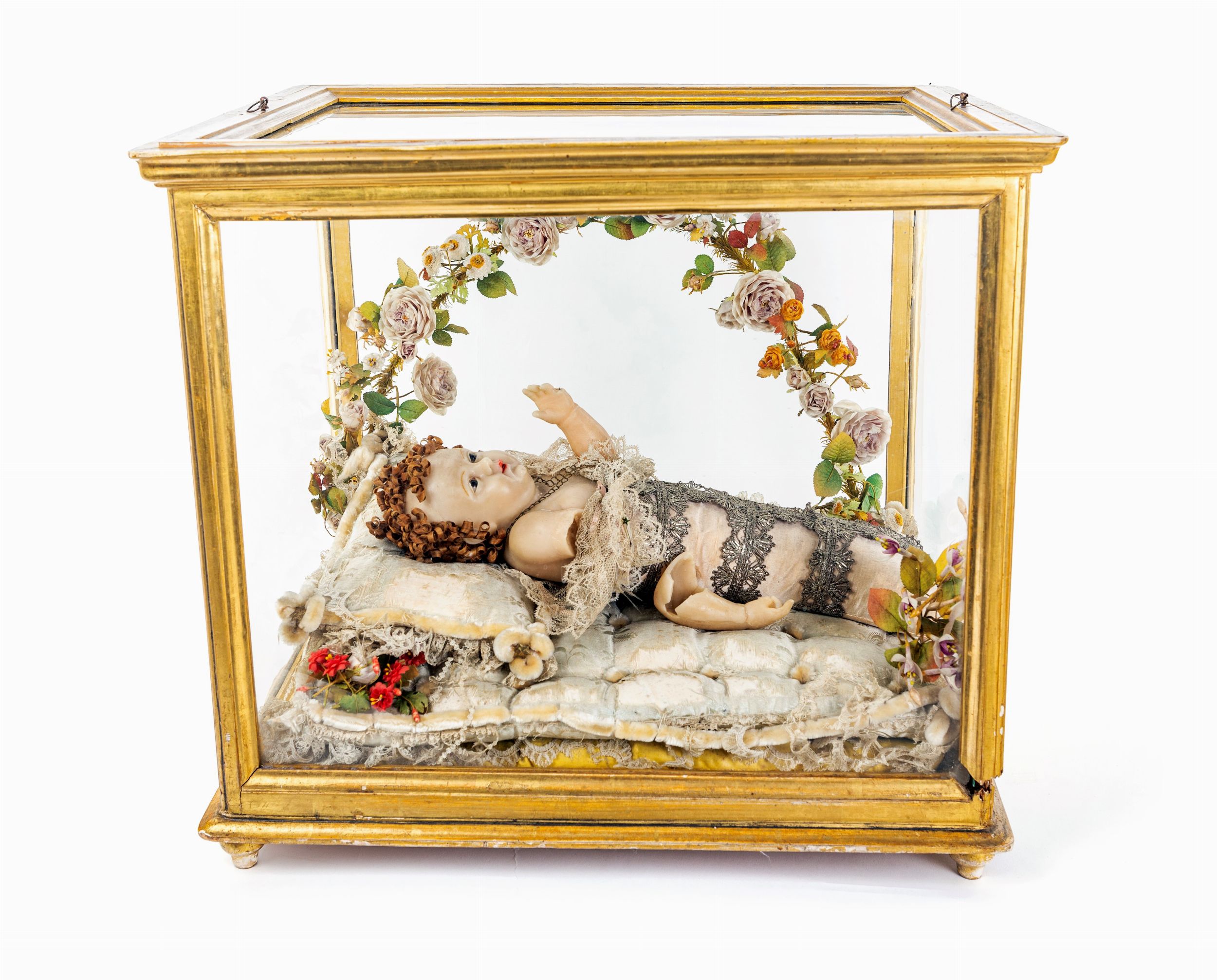 Teca in legno dorato contenente Bambin Gesù in cera, XIX secolo