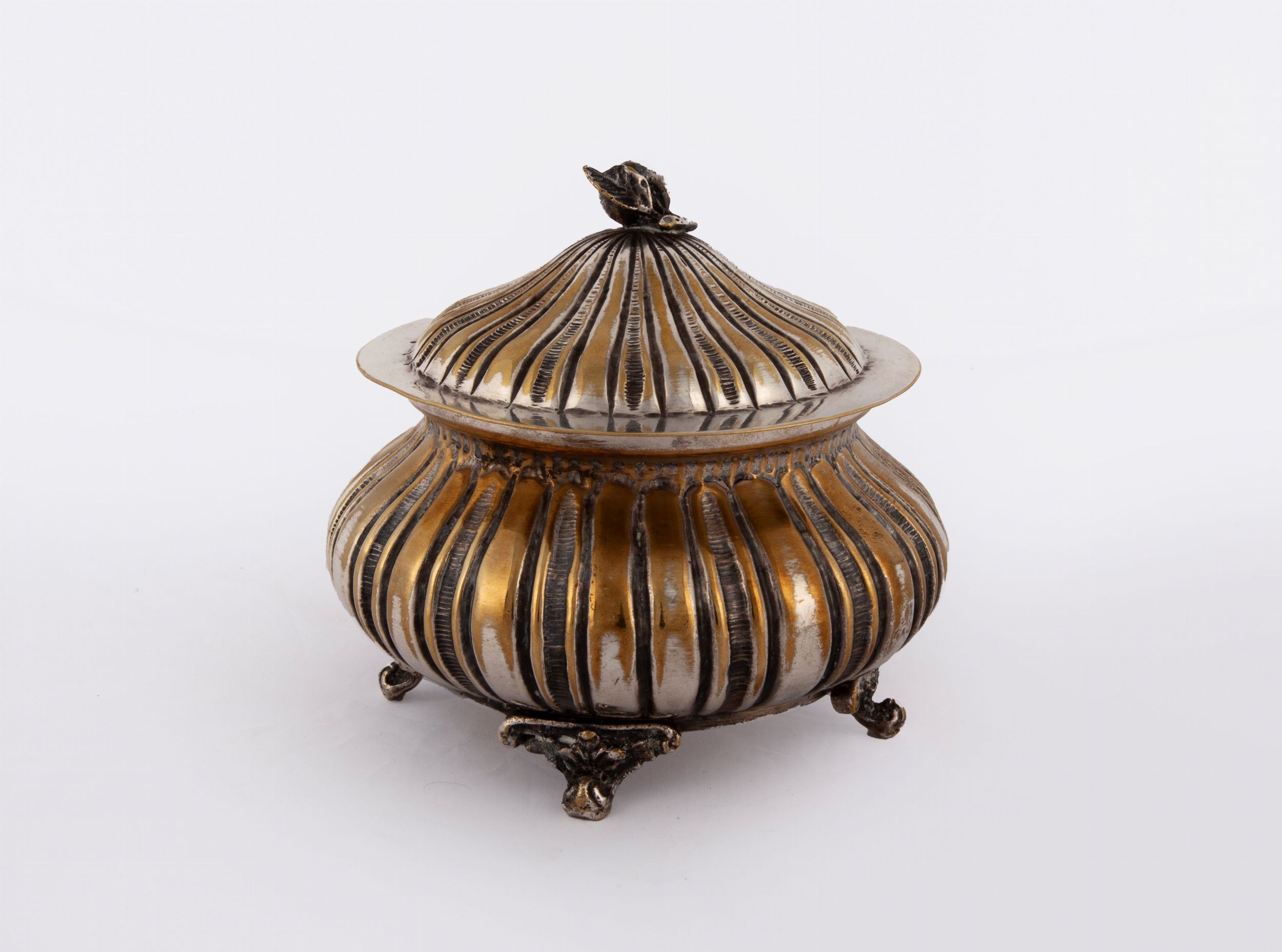 di forma circolare percorsa da baccelli alternati a scanalature, quattro piedini, coperchio sormontato da un frutto; dorata anche internamente