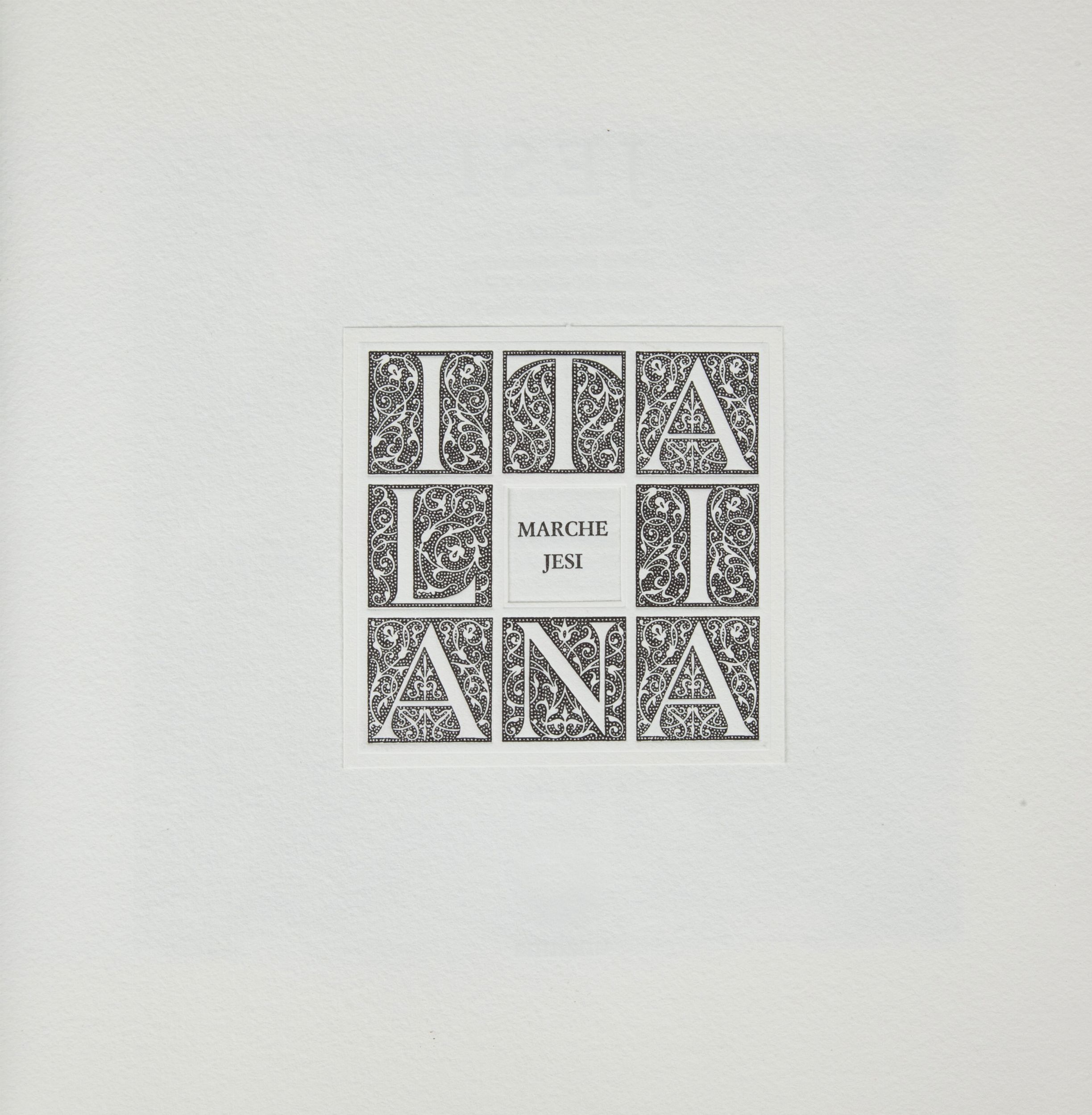 cm 24x24 - cm 28x28 il cofanetto Edizione stampata al torchio in tiratura limitata 200 esemplari, ns. esemplare n. 156, presso L'Officina Olivieri di Milano, con opere grafiche di Carlo Cecchi, Luigi Pennacchietti, Mario Sasso e Luigi Teodosi, impresse dai torchi di Giancarlo Sardella in Milano con coloritura di Sara Tozzi e capilettera disegnati da Luigi Pennacchietti. Testi di Bigliardi, Filosa, Ginesi e Ramini. Legatura in pelle conciata a mano con incisione sul piatto. Entro cofanetto in legno con incisione.