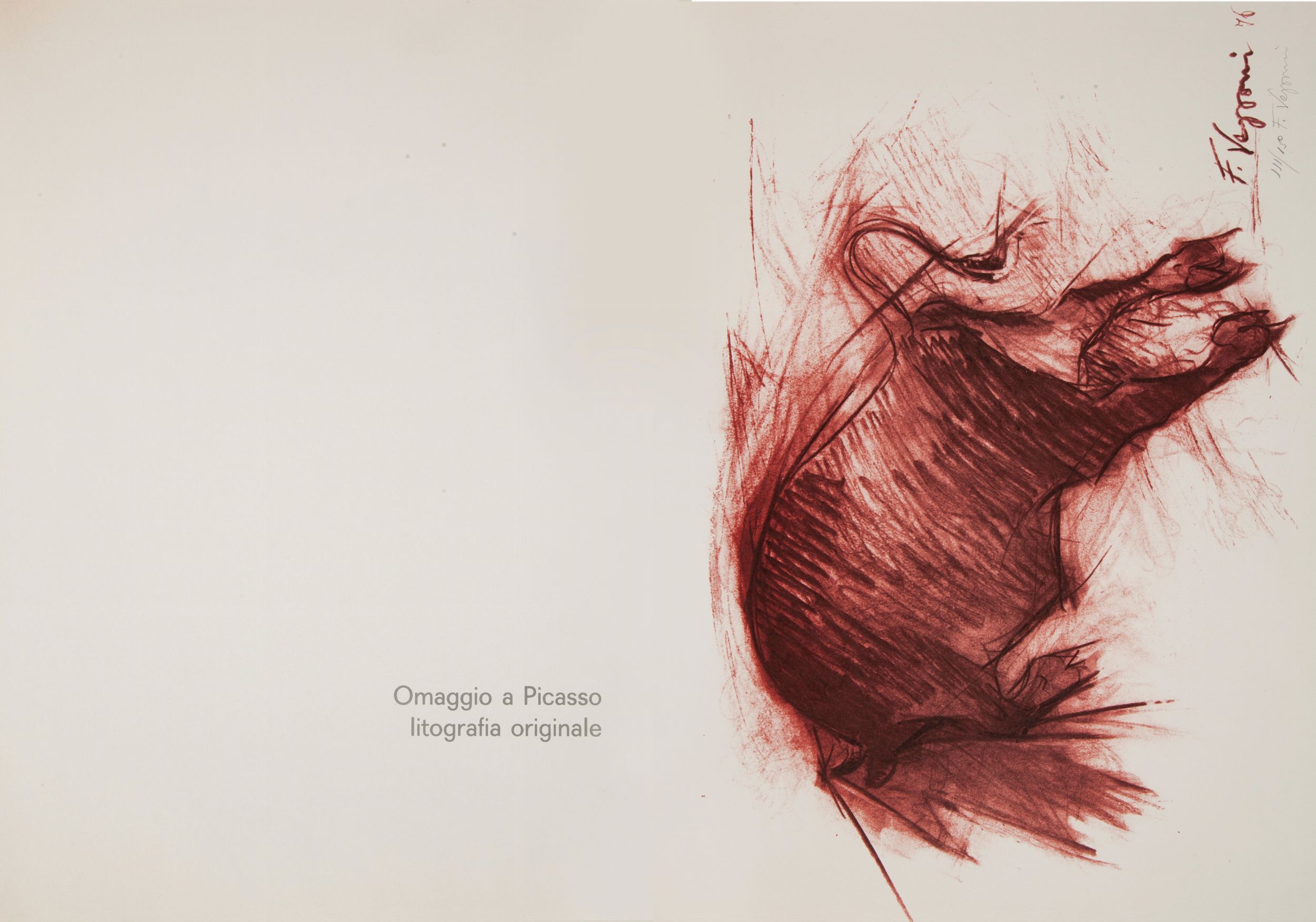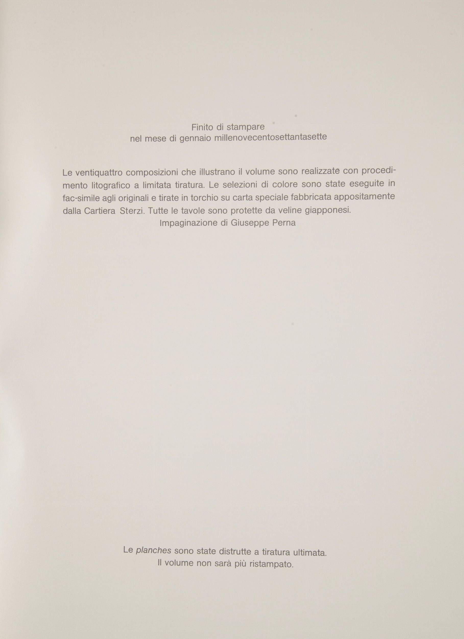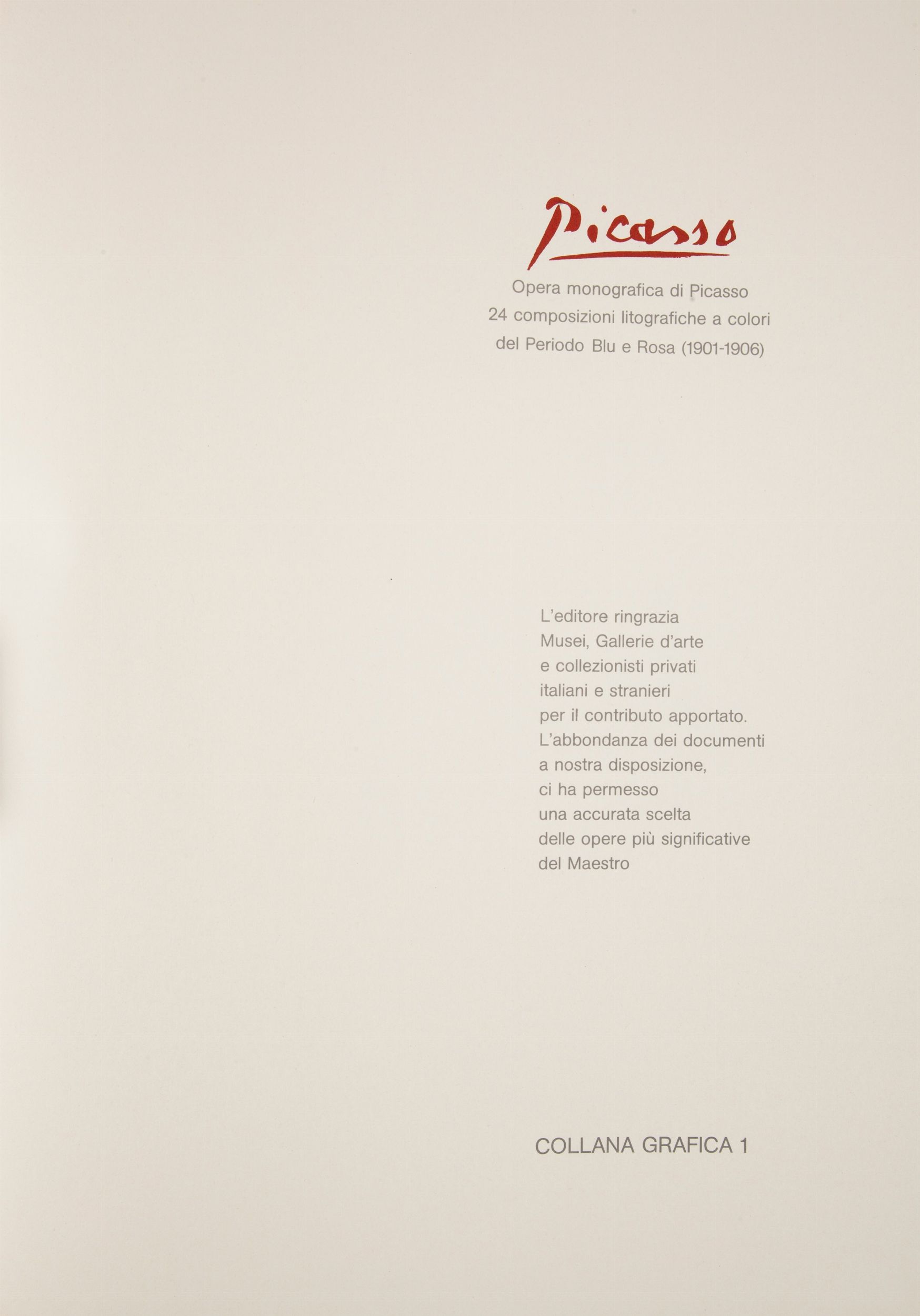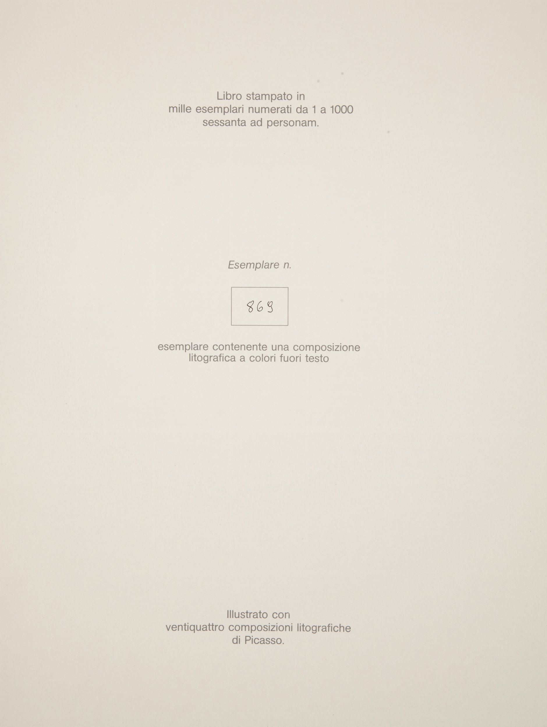 cm 50x38 Centro Diffusione Cultura, Milano 1976-7 Tiratura limitata in 1.000 esemplari numerati ns. n.869. Tavole tirate al torchio su carta speciale della Cartiera Sterzi. Contenente una litografia a colori originale fuori testo di F. Vezzani del 1976 Omaggio a Picasso es. 111/150. Note critiche di Elda Fezzi. Legatura in similpelle con titoli in oro al dorso e al piatto. Entro cofanetto originale in cartonato e similpelle.