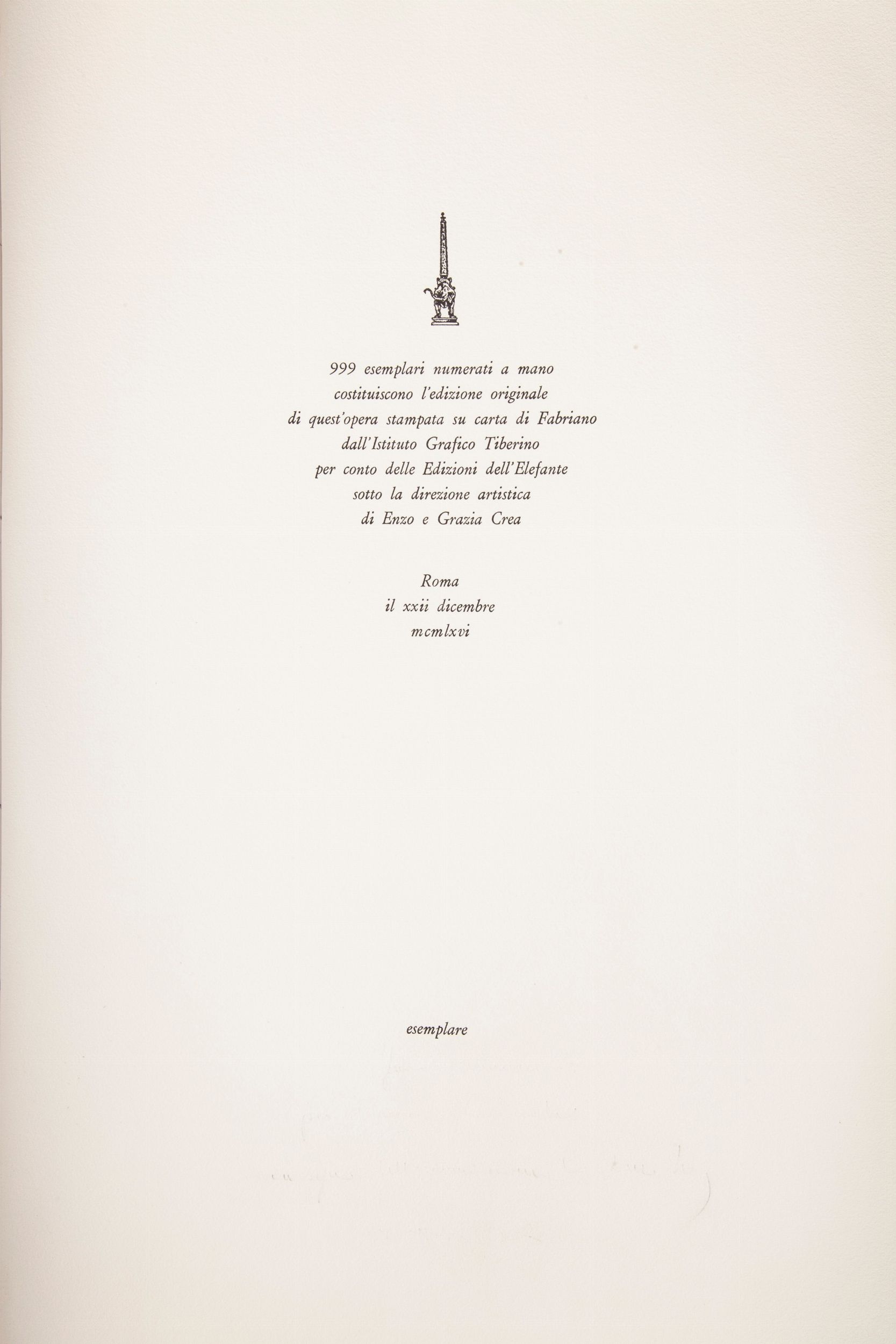 cm 54x37,5 Edizioni dell' Elefante, Roma 1966 Edizione limitata tirata a 999 esemplari numerati. Ns. esemplare non numerato. Preziosa legatura in pelle con piatti in legno e dorso con nervi e titolo in oro. Stampato su carta Fabriano dall'Istituto Grafico Tiberino di Roma a cura di Enzo Crea. Entro cofanetto originale (con lievi difetti).