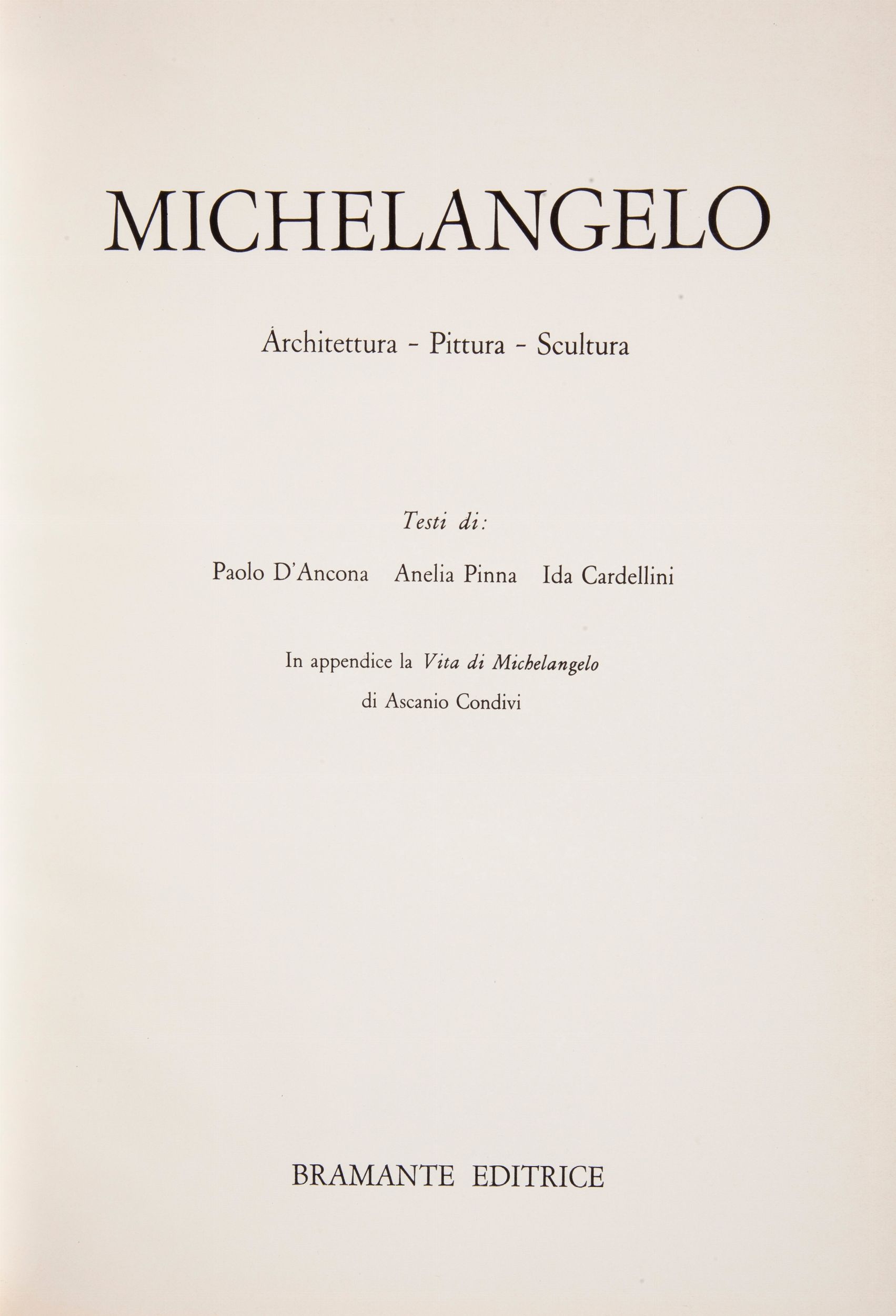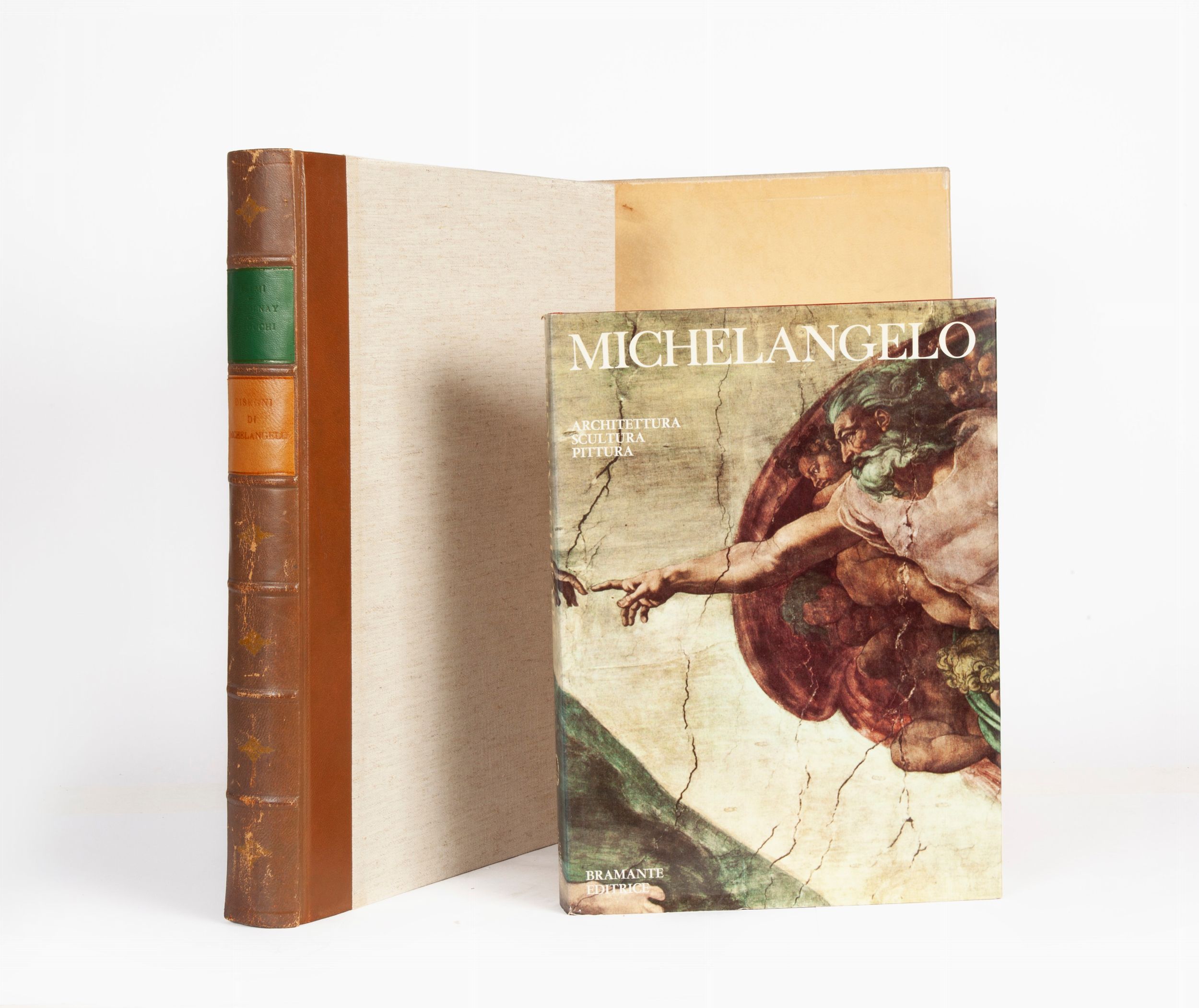 Legatura in mezza pelle e tela editoriale, entro cofanetto originale. Nel Lotto: Paolo d'Ancona / Amelia Pinna / Ida Cardellini - Michelangelo. Architettura Pittura Scultura, Bramante editrice, Milano 1964