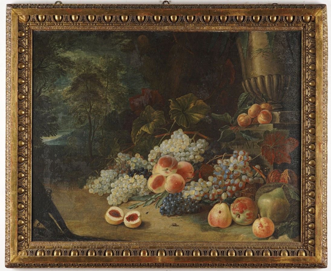 Scuola del XVIII/XIX secolo Natura morta di frutta in un paesaggio e vaso sullo [..]