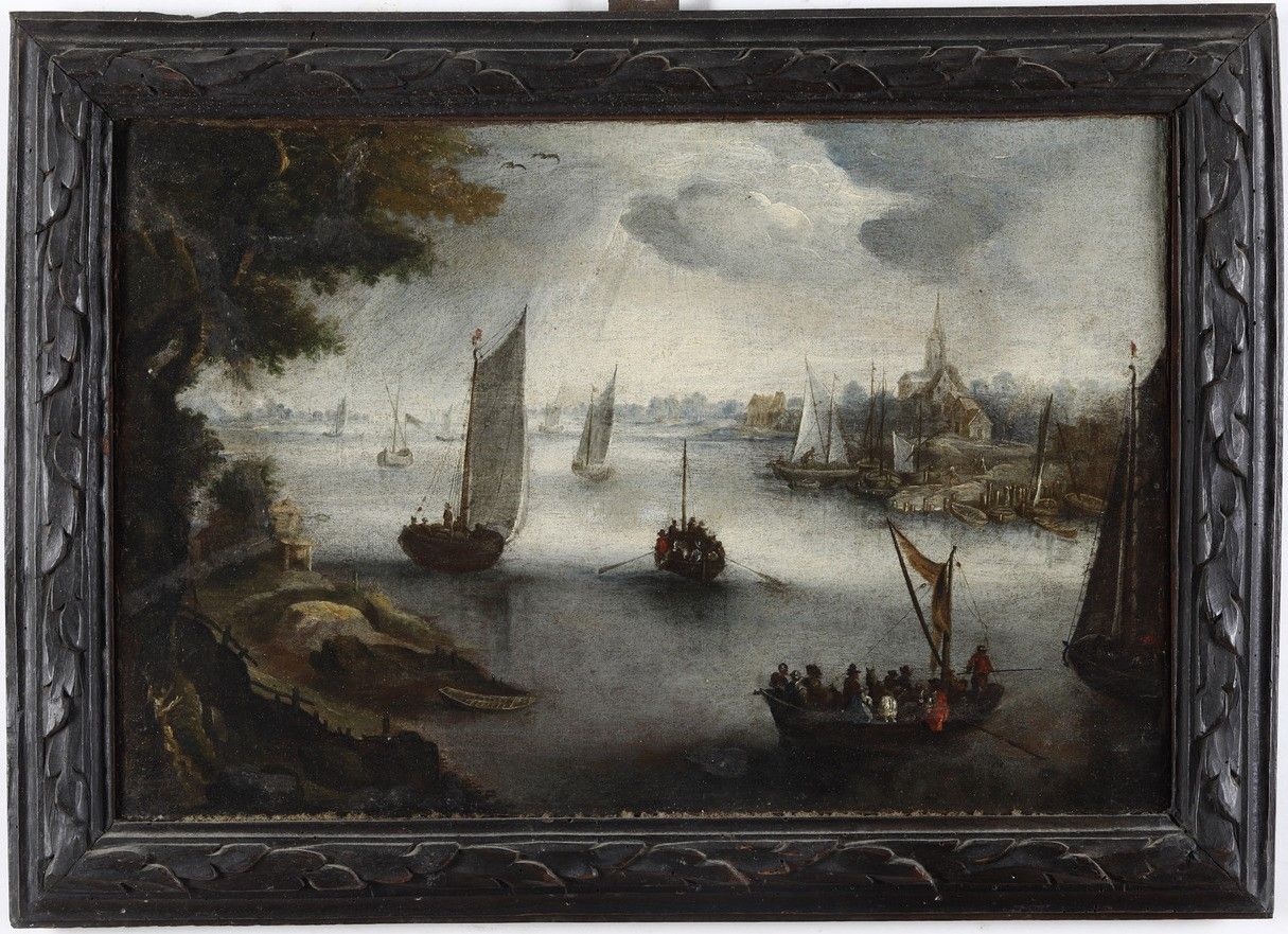 Scuola fiamminga del XVII secolo Paesaggio fluviale con imbarcazioni
