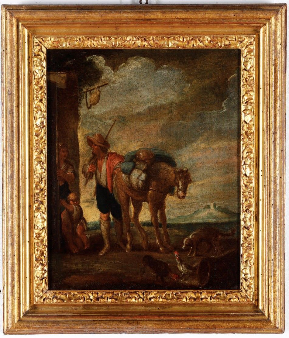 Scuola fiamminga del XVII secolo Viandante con bambino e cavallo