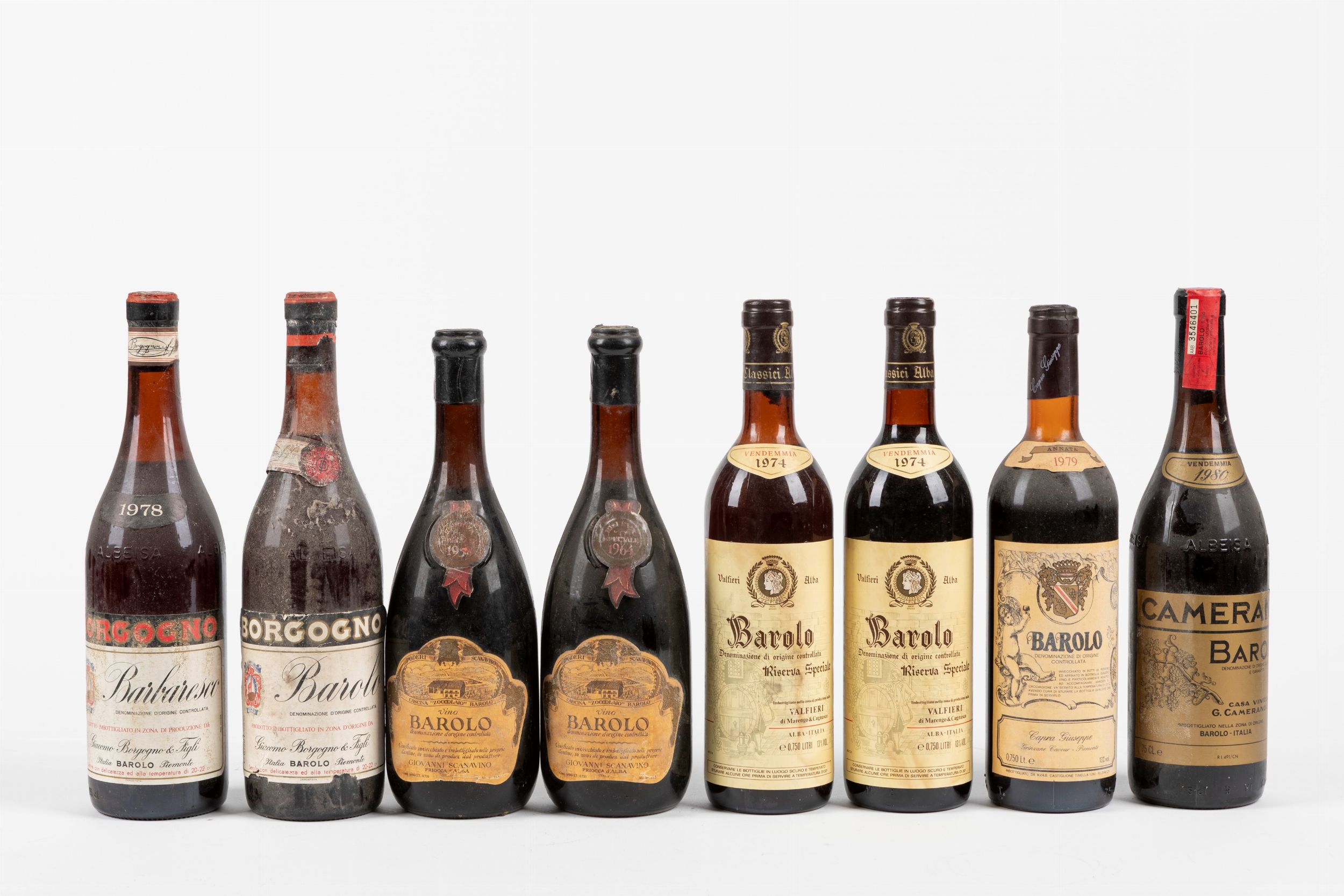 Selezione Langhe (8 BT)Barbaresco Borgogno 1978 DOCGBarolo Borgogno DOCG Barolo Giovanni Scanavino (2 BT) DOCGBarolo Valfieri Riserva Speciale 1974 (2 BT) Barolo Capra 1979 DOCG Barolo Camerano DOCG