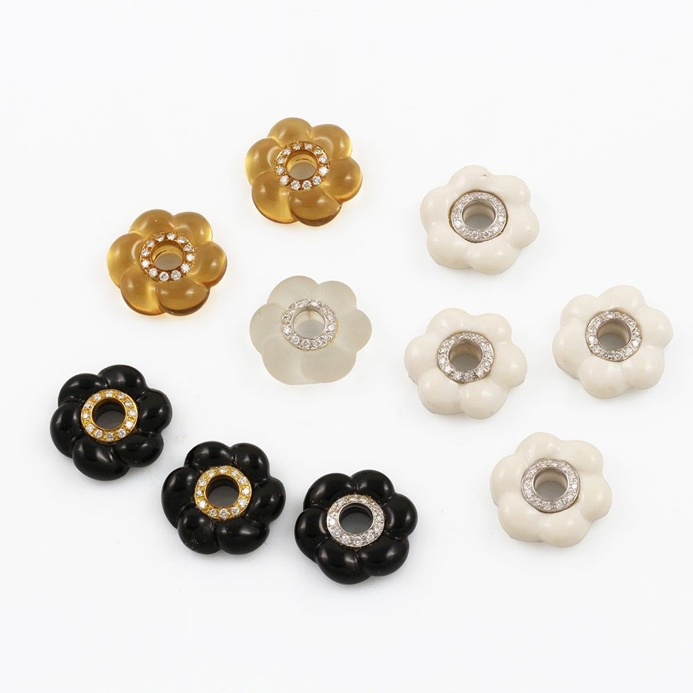 a fiore in agata bianca, onice, cristallo di rocca e quarzo citrino, montati in oro giallo e oro bianco con piccoli brillanti.Diametro 1,7 cm ca.