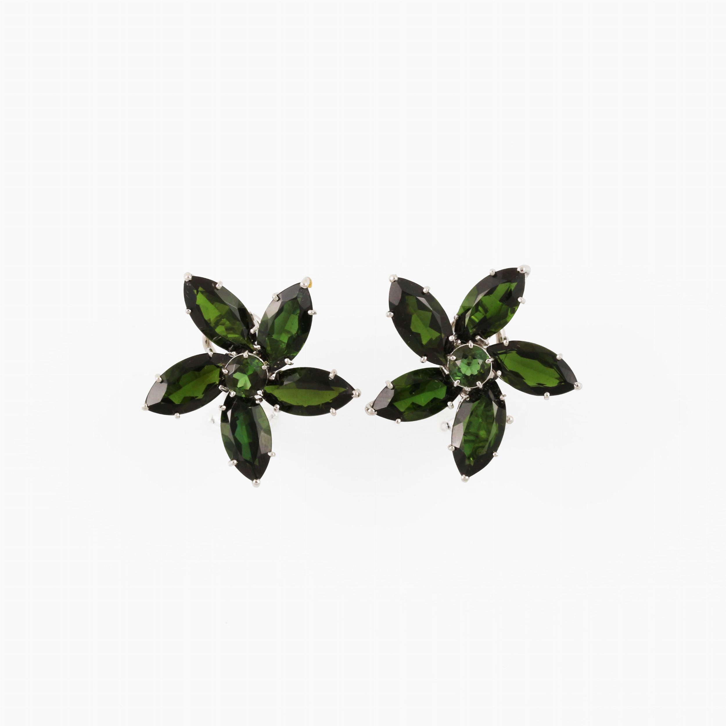 a fiore con tormaline verdi, montati in oro bianco con clip e perno, gr. 11,1.Diametro 2,6 cmFirmati: Loris Abate