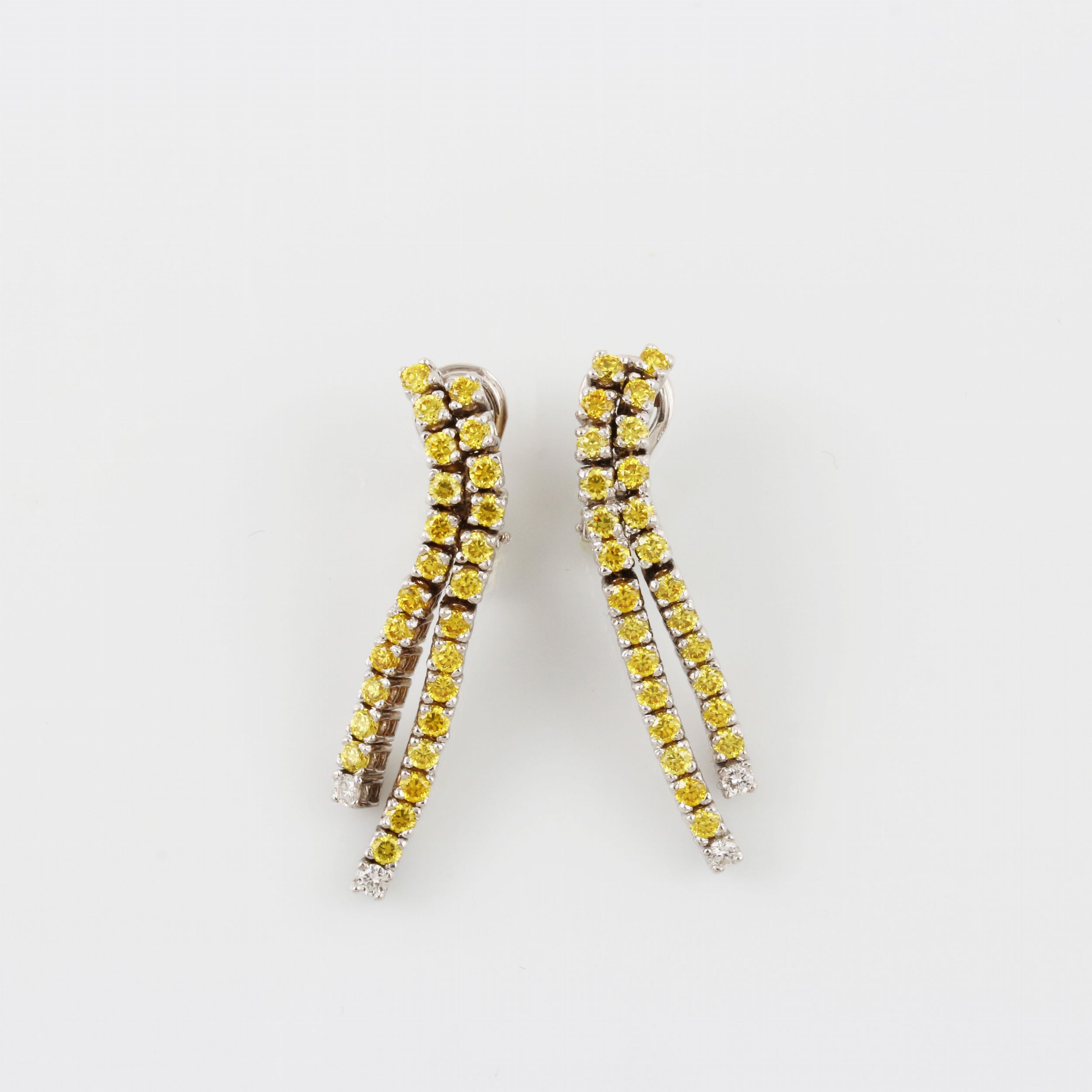 pendenti con clip e perno in oro bianco a doppia rivière con pietre sintetiche gialle e brillanti incolore terminali, gr. 16. Lunghezza 4,5 cm ca.