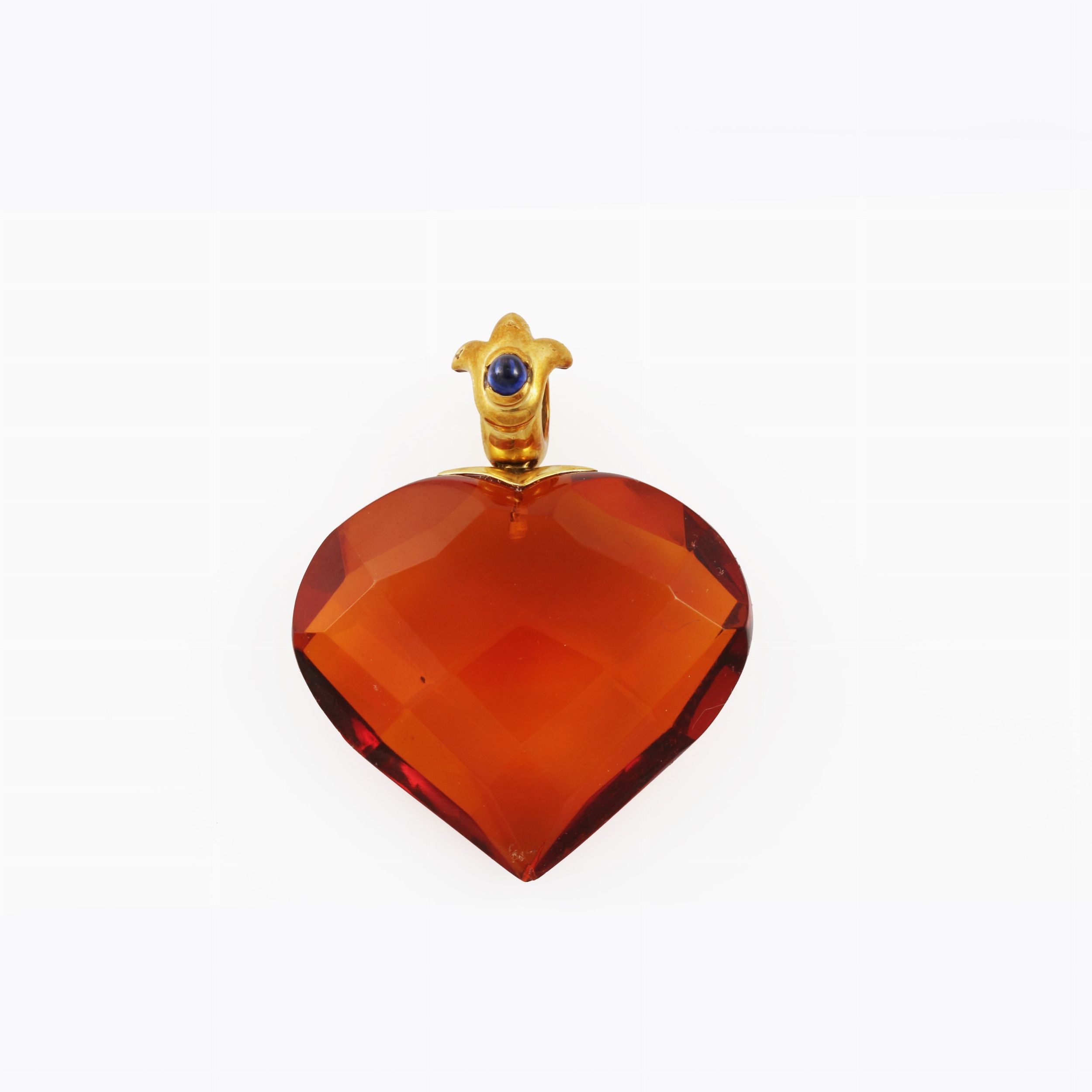grande cuore sfaccettato in ambra montatura in oro giallo con piccolo zaffiro cabochon, gr. 15,6.