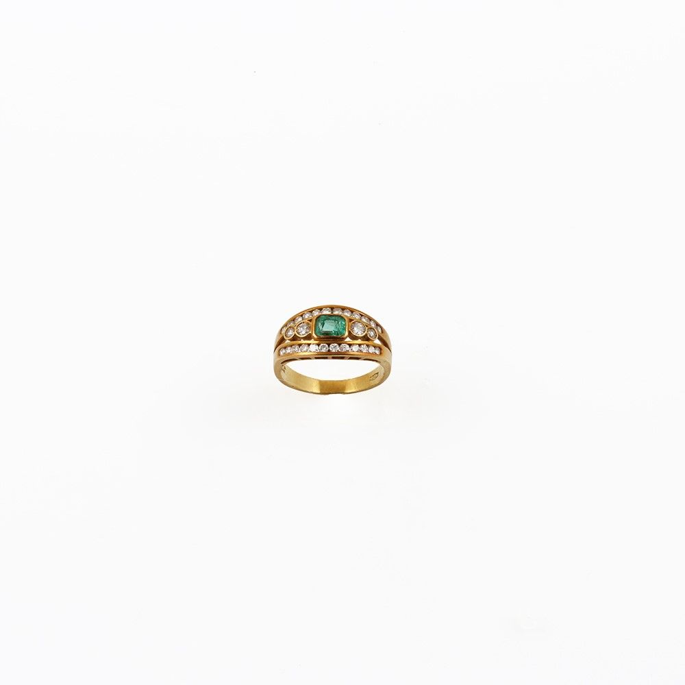 in oro giallo a fascia sagomata con smeraldo centrale e brillanti ad ornamento, gr. 5,6.