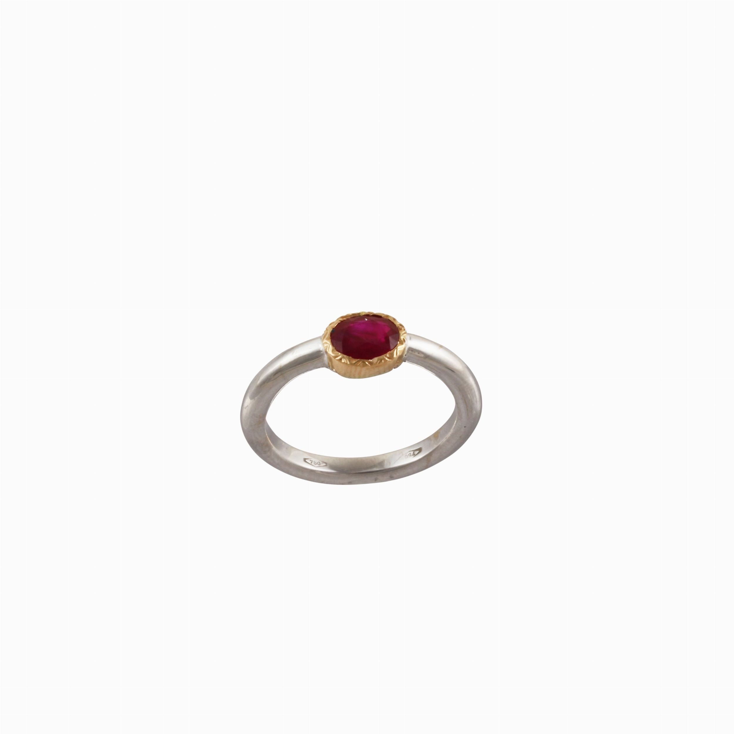 in oro bianco e giallo con rubino ovale del peso di 1 ct ca., gr. 5,1.