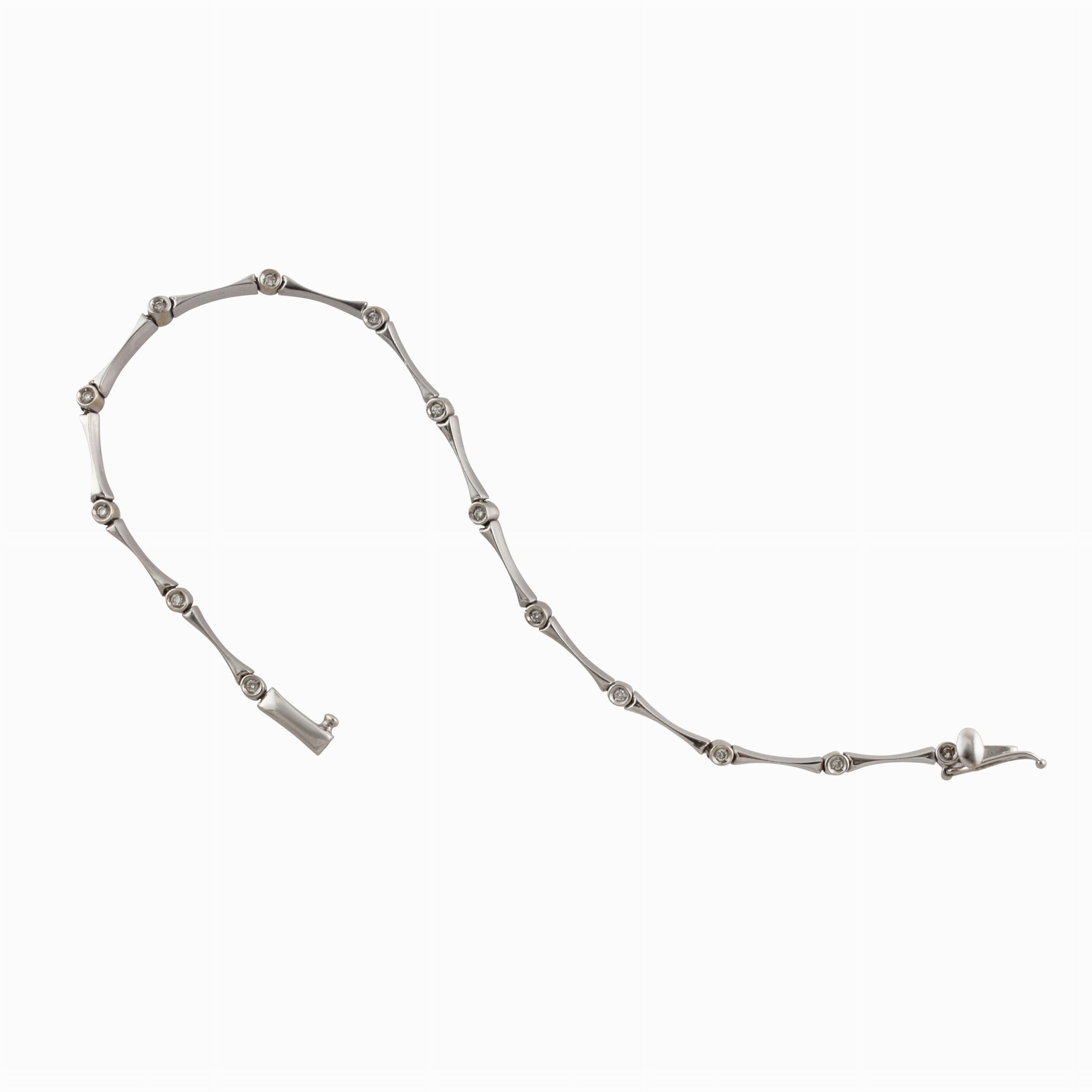in oro bianco costituito da segmenti snodati intervallati da piccoli brillanti, gr. 7,9.Lunghezza 17,5 cm